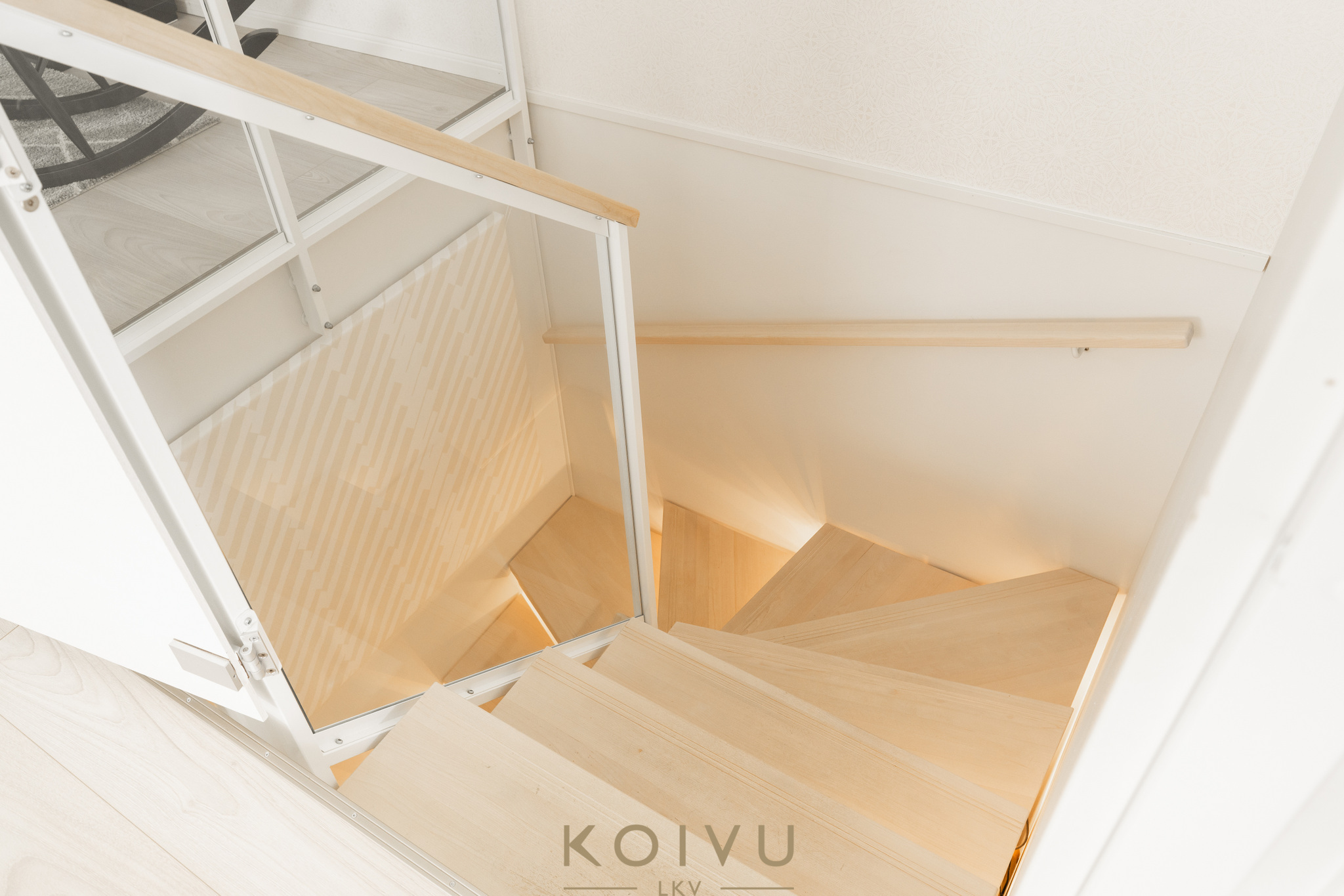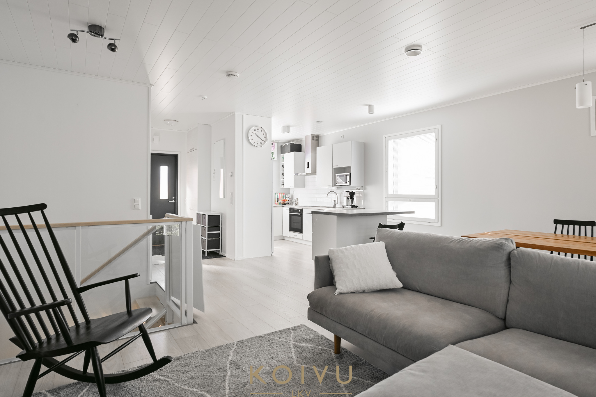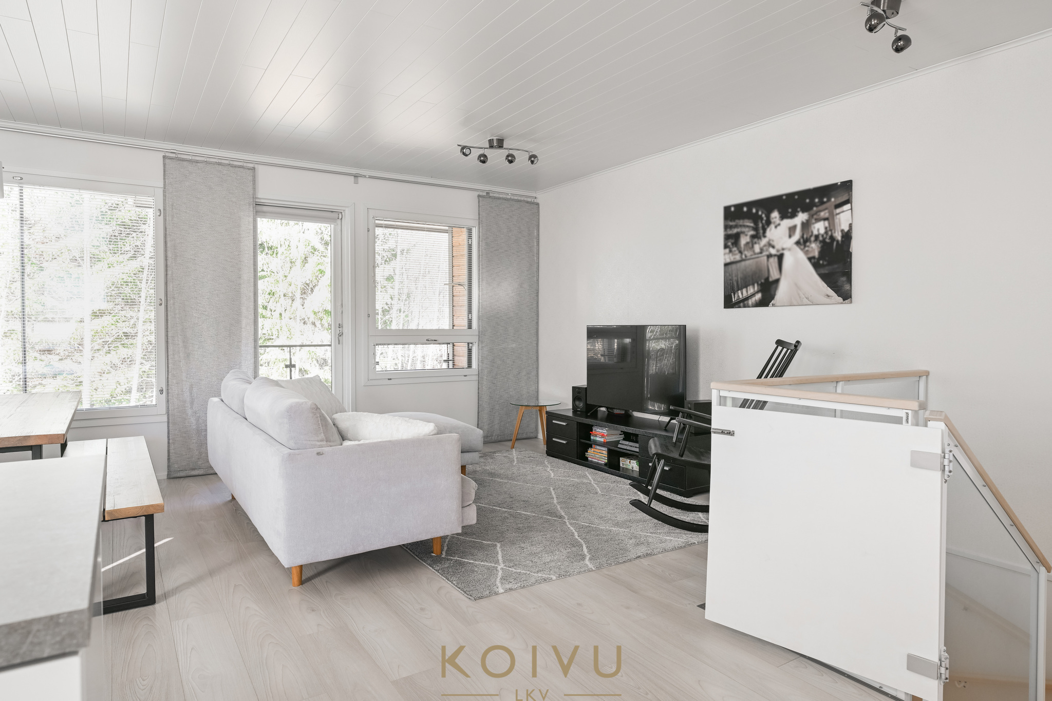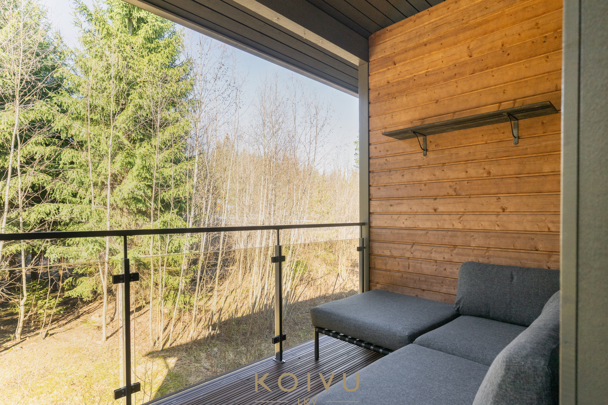 Asunnon ilme on moderni ja huoliteltu. Tilaa rytmittävät lasikaiteet tuovat sisätiloihin keveyttä ja viimeisteltyä ilmettä, ja sama ajatus jatkuu myös ulkotiloissa, joissa lasikaiteet viimeistelevät kokonaisuuden raikkaasti. Ratkaisu korostaa valoa, avaruutta ja kodin nykyaikaista linjaa ilman, että kokonaisuus menettää lämpöään.