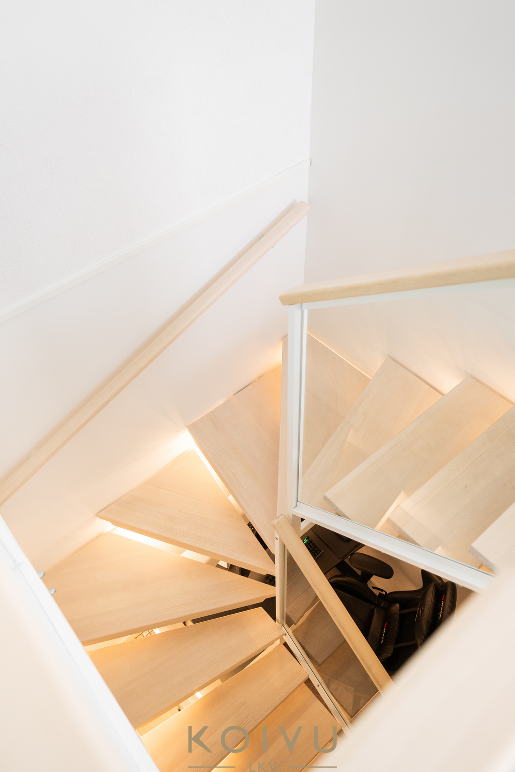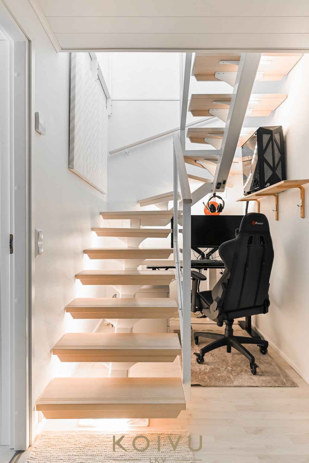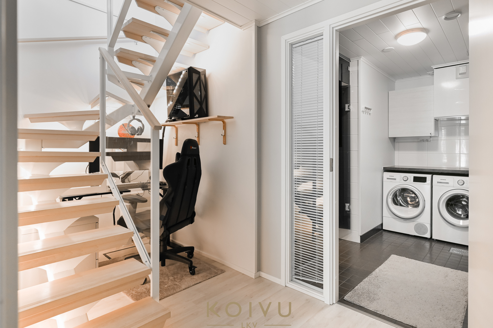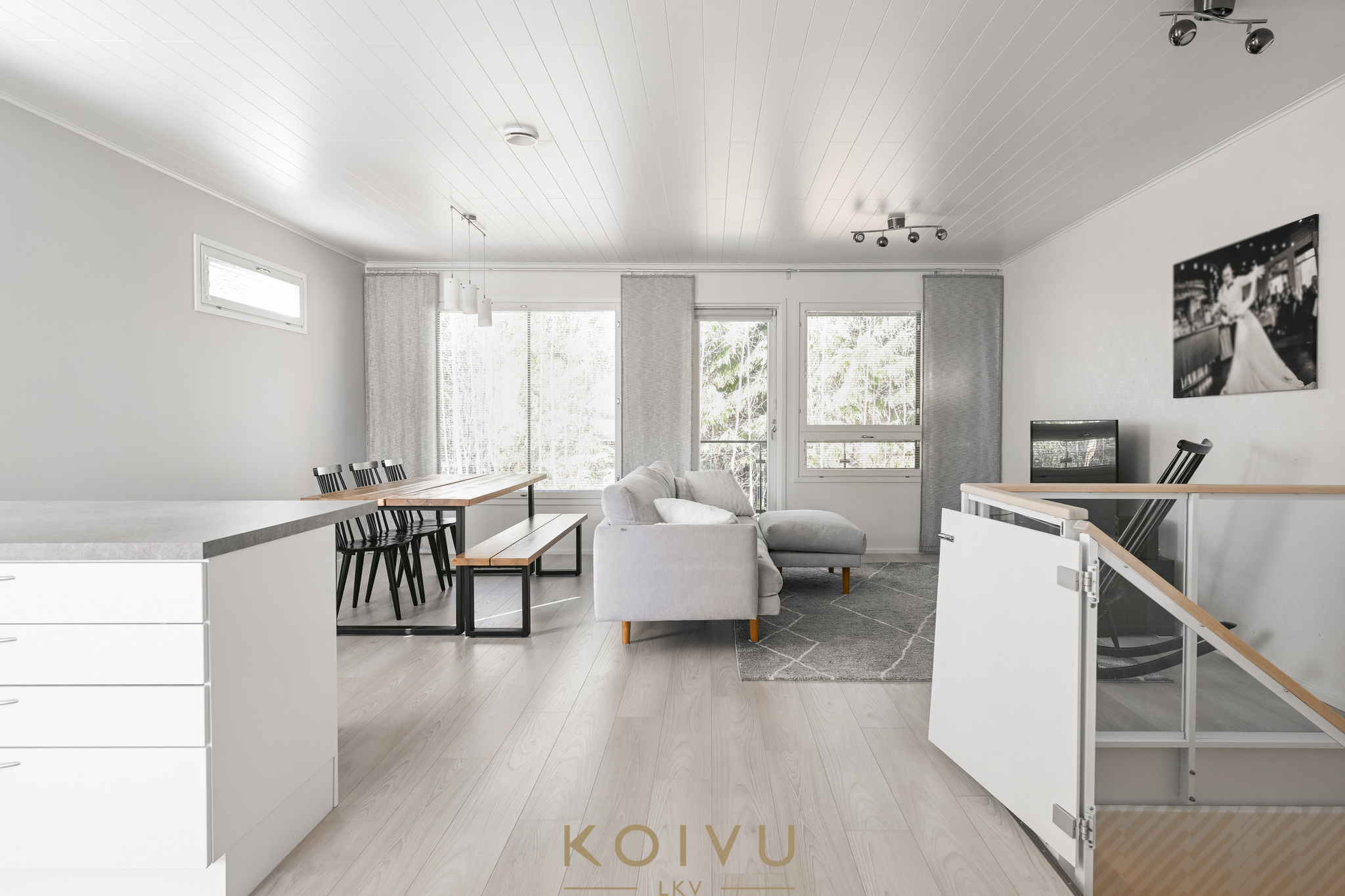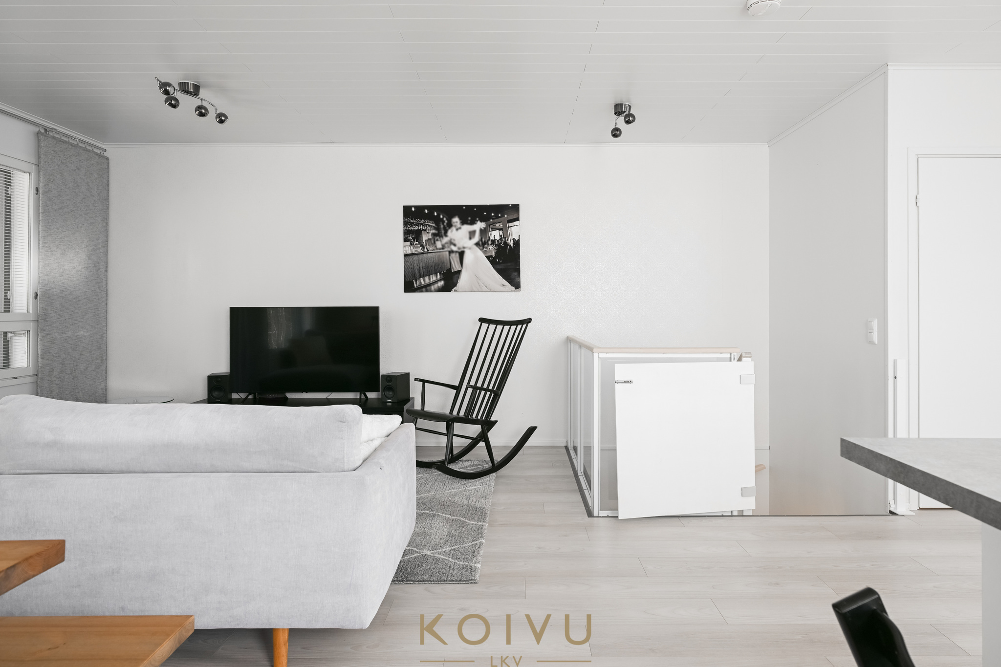 Asunnon ilme on moderni ja huoliteltu. Tilaa rytmittävät lasikaiteet tuovat sisätiloihin keveyttä ja viimeisteltyä ilmettä, ja sama ajatus jatkuu myös ulkotiloissa, joissa lasikaiteet viimeistelevät kokonaisuuden raikkaasti. Ratkaisu korostaa valoa, avaruutta ja kodin nykyaikaista linjaa ilman, että kokonaisuus menettää lämpöään.