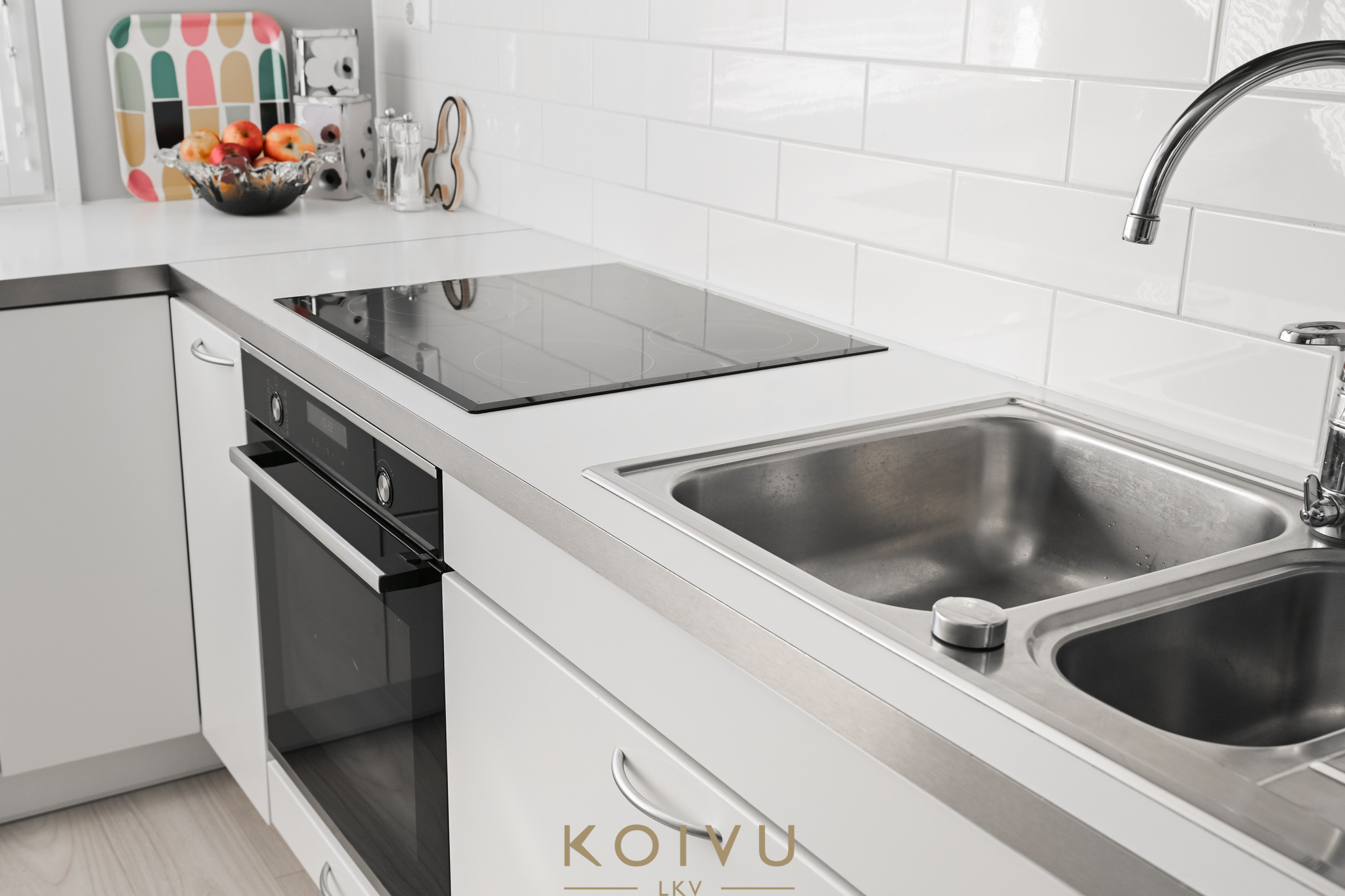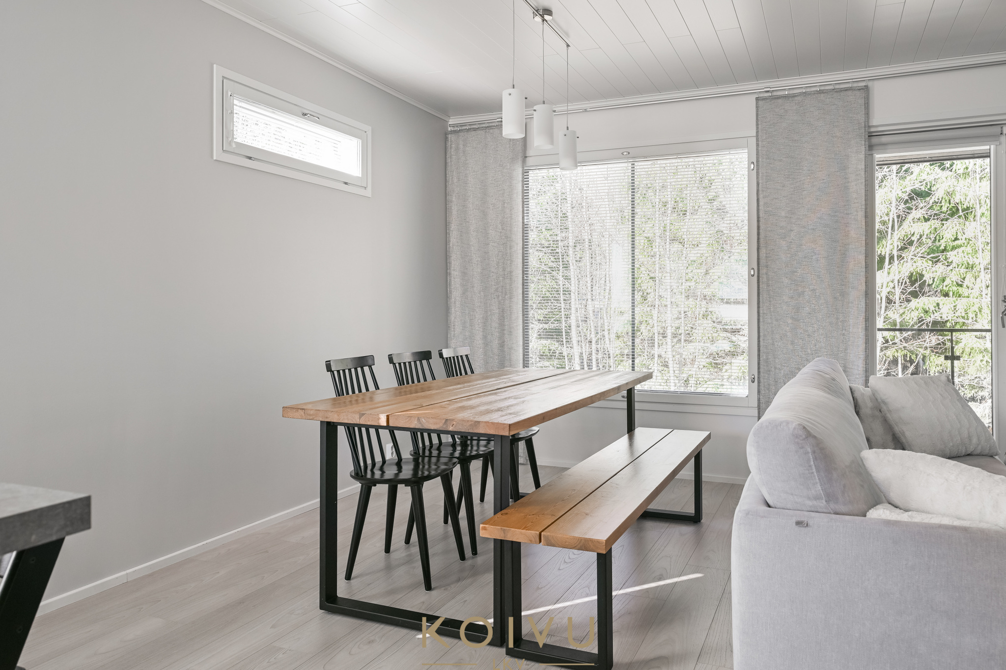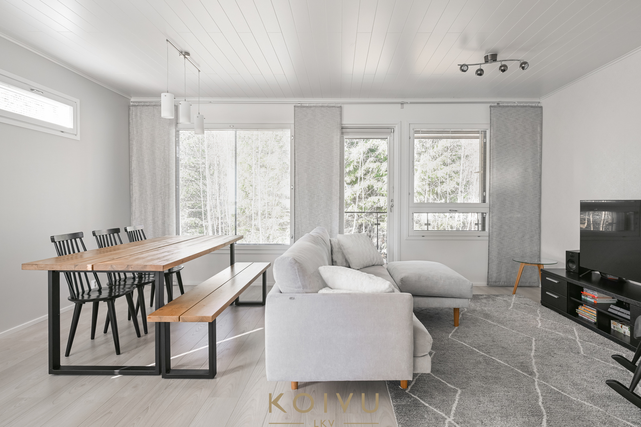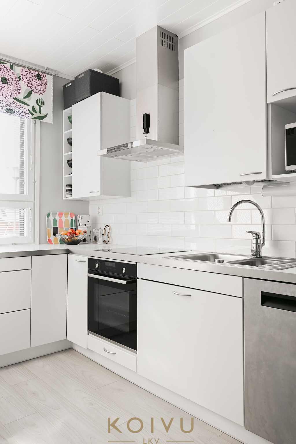 Asunnon ilme on moderni ja huoliteltu. Tilaa rytmittävät lasikaiteet tuovat sisätiloihin keveyttä ja viimeisteltyä ilmettä, ja sama ajatus jatkuu myös ulkotiloissa, joissa lasikaiteet viimeistelevät kokonaisuuden raikkaasti. Ratkaisu korostaa valoa, avaruutta ja kodin nykyaikaista linjaa ilman, että kokonaisuus menettää lämpöään.