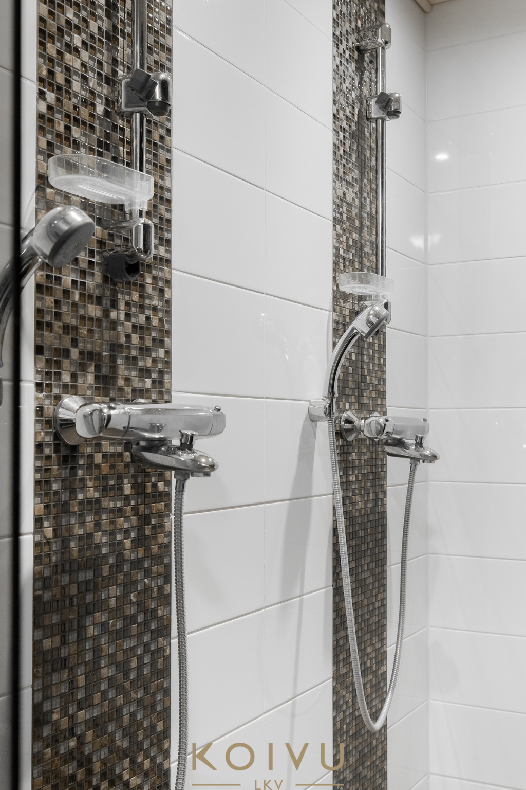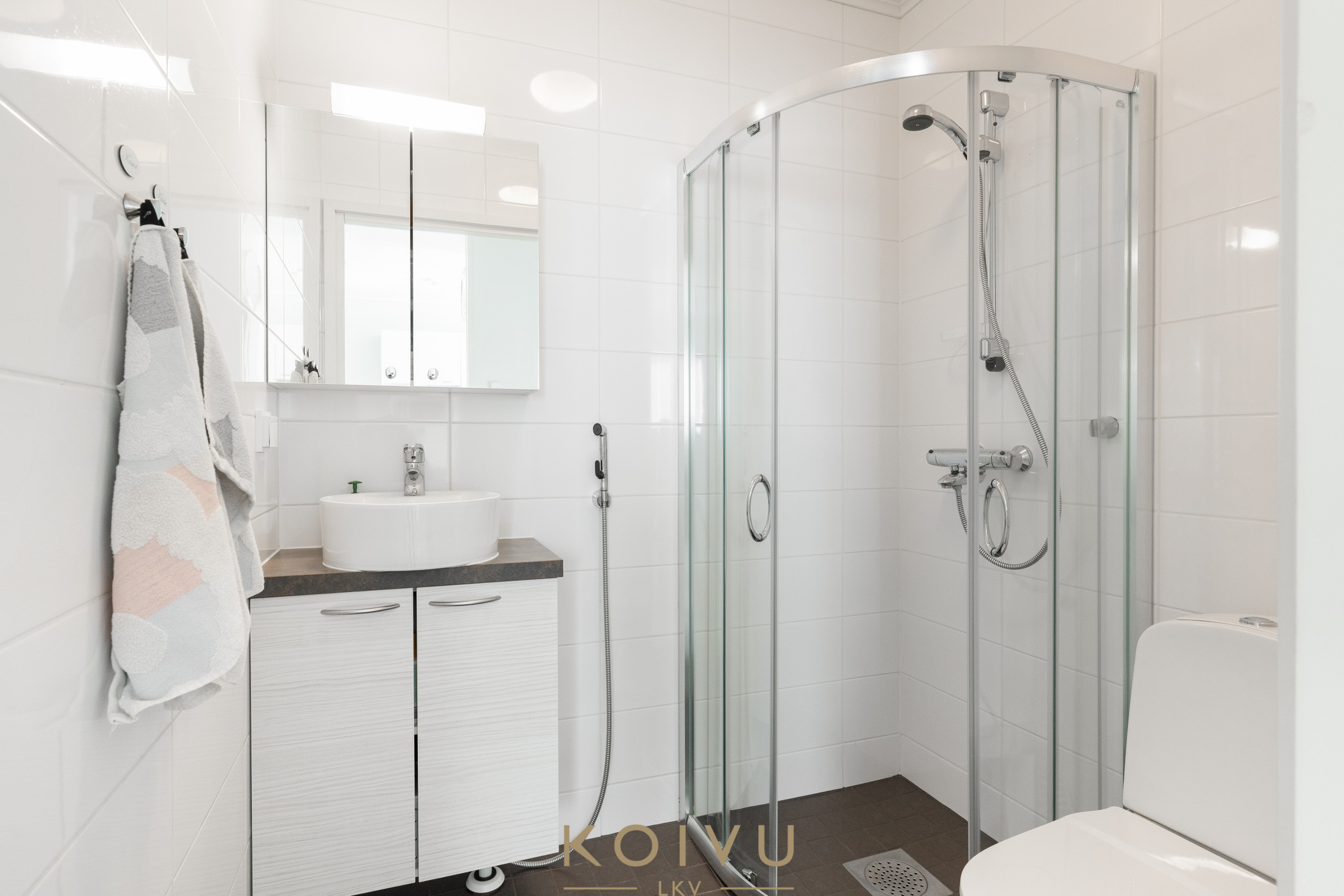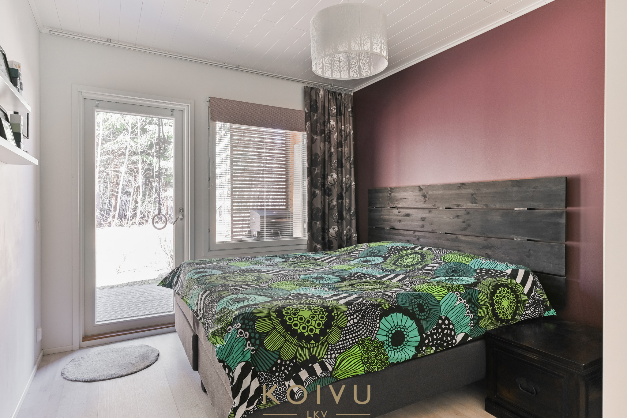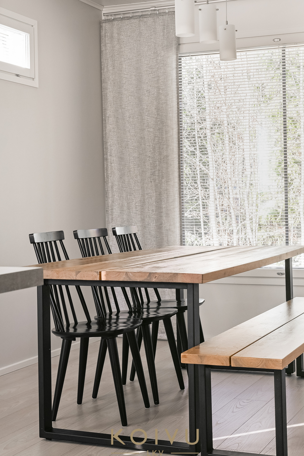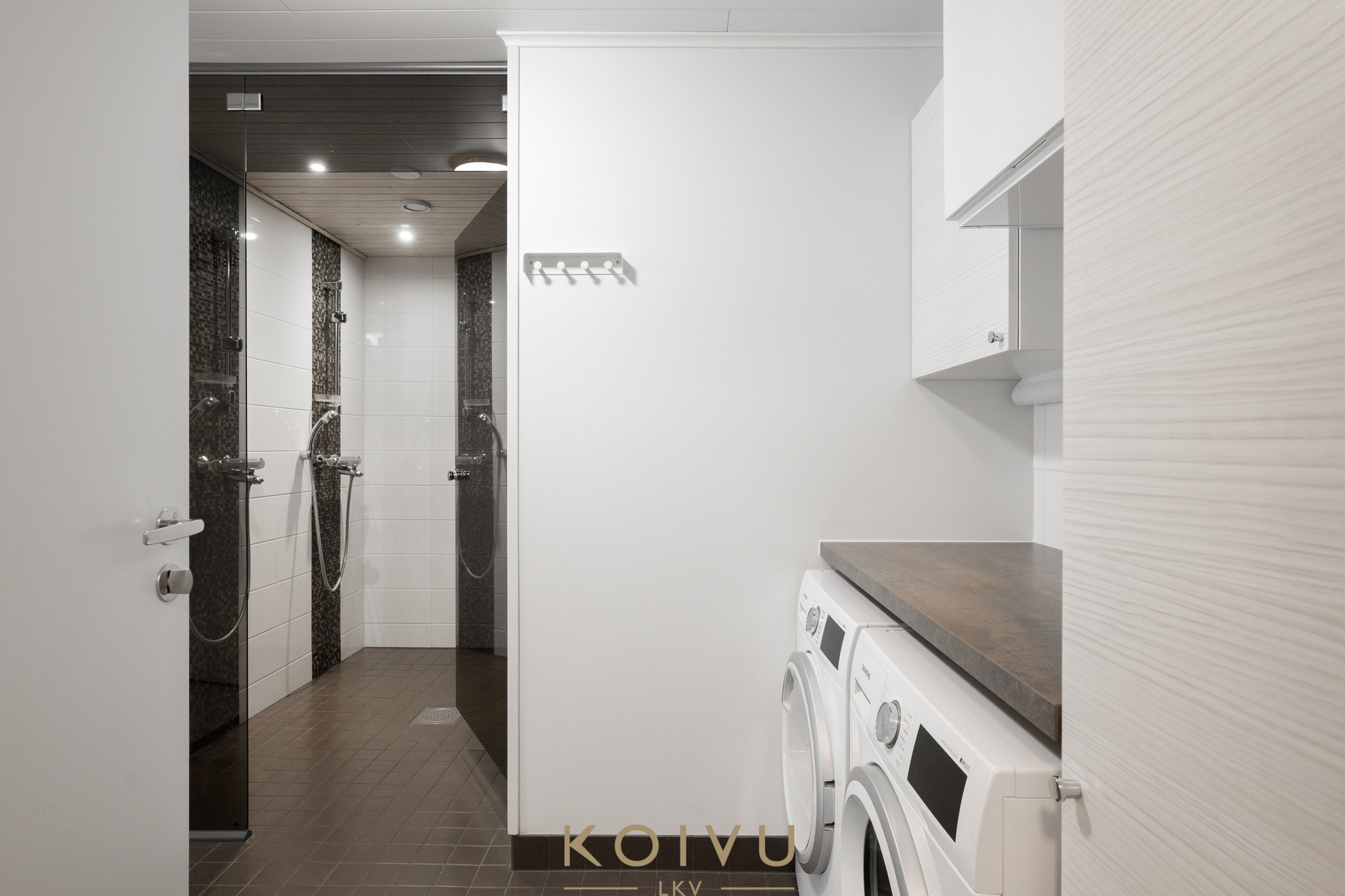 Asunnon ilme on moderni ja huoliteltu. Tilaa rytmittävät lasikaiteet tuovat sisätiloihin keveyttä ja viimeisteltyä ilmettä, ja sama ajatus jatkuu myös ulkotiloissa, joissa lasikaiteet viimeistelevät kokonaisuuden raikkaasti. Ratkaisu korostaa valoa, avaruutta ja kodin nykyaikaista linjaa ilman, että kokonaisuus menettää lämpöään.