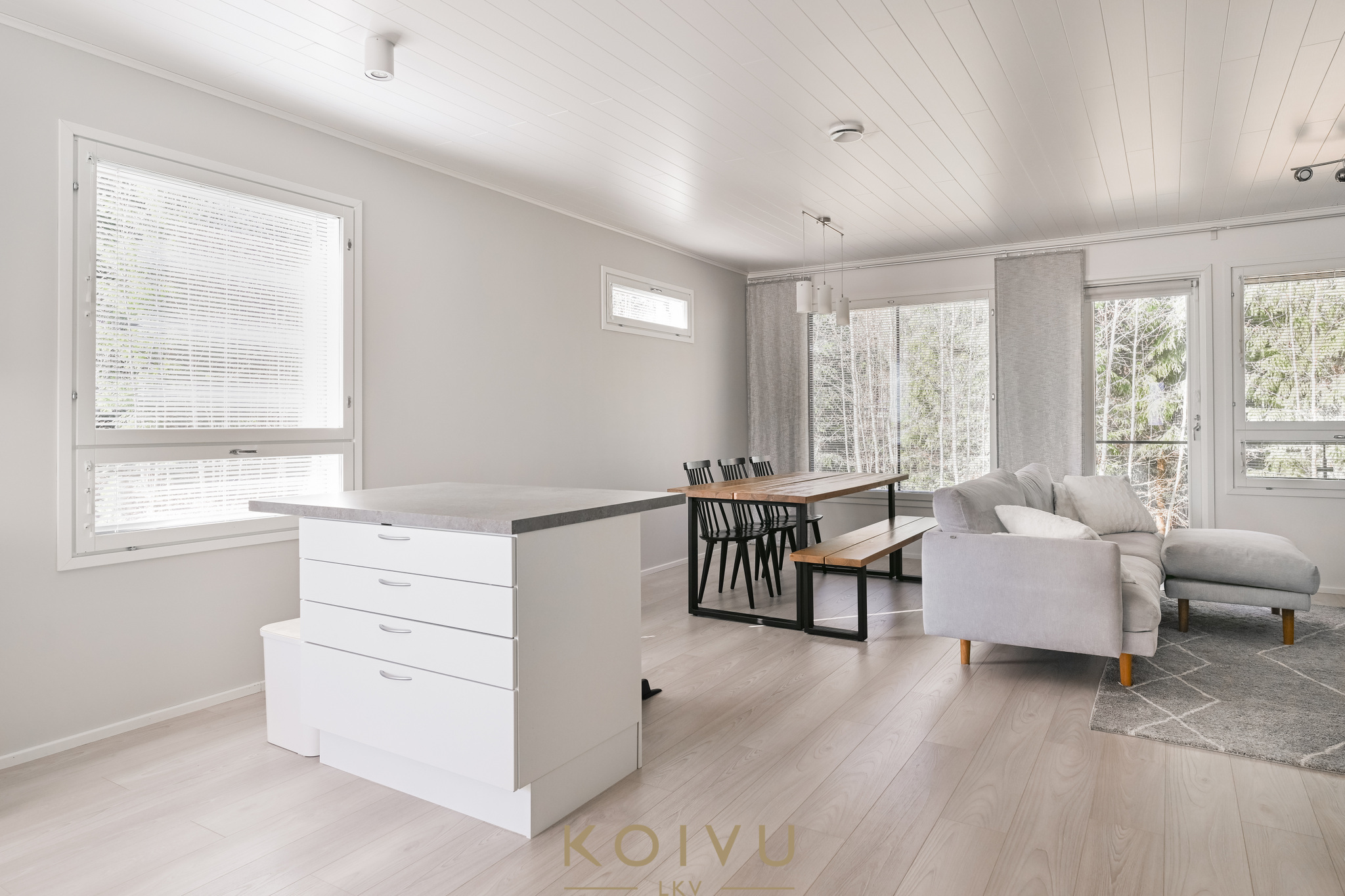 Oleskelutilat muodostavat kodin sydämen. Keittiö ja ruokailutila avautuvat olohuoneen yhteyteen luontevasti, mikä tekee pohjasta toimivan niin arjessa kuin yhdessäolossa. Kaksi makuuhuonetta ja sauna sekä pesutilat tukevat alakerrassa sujuvaa arkea.