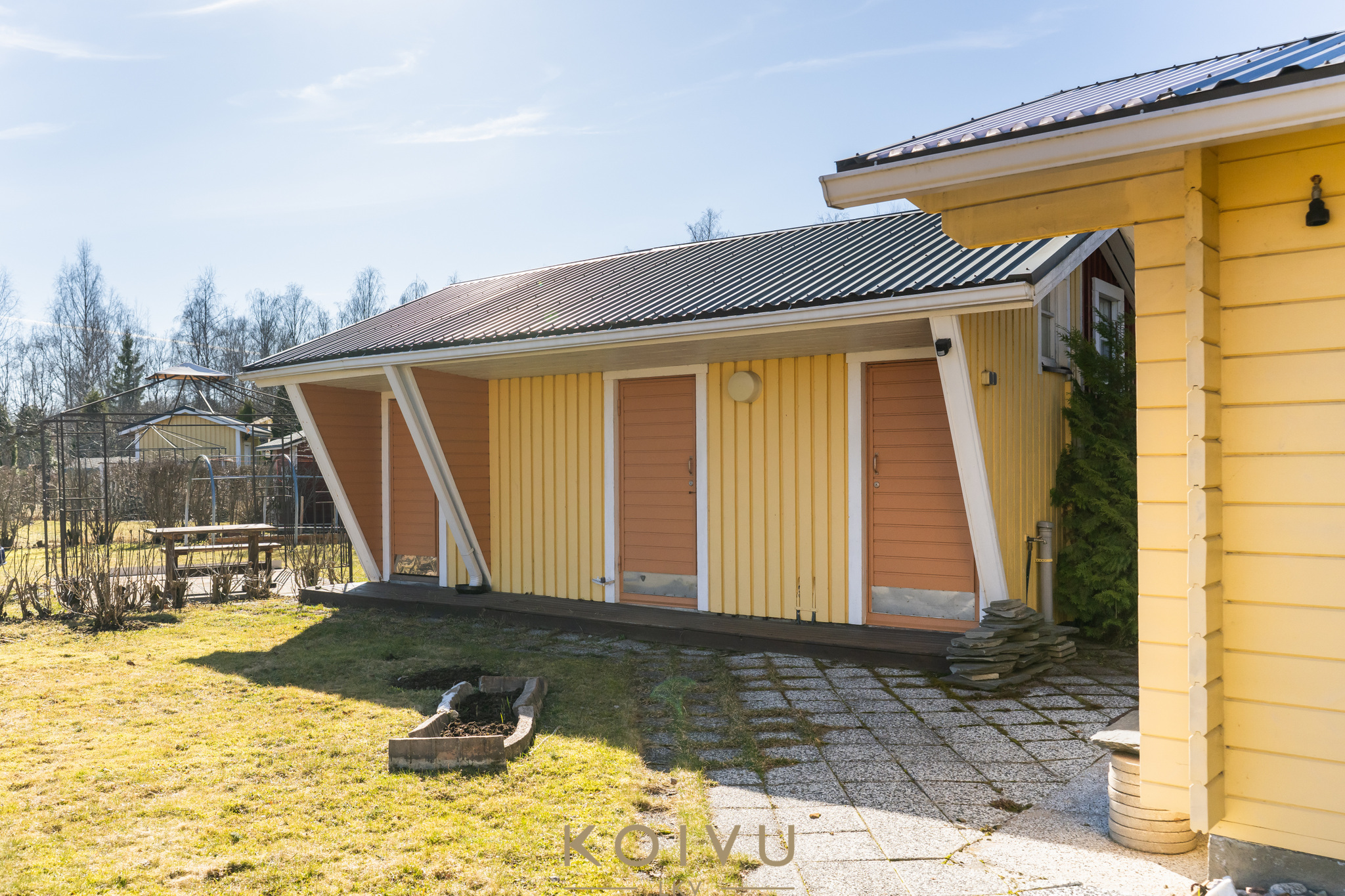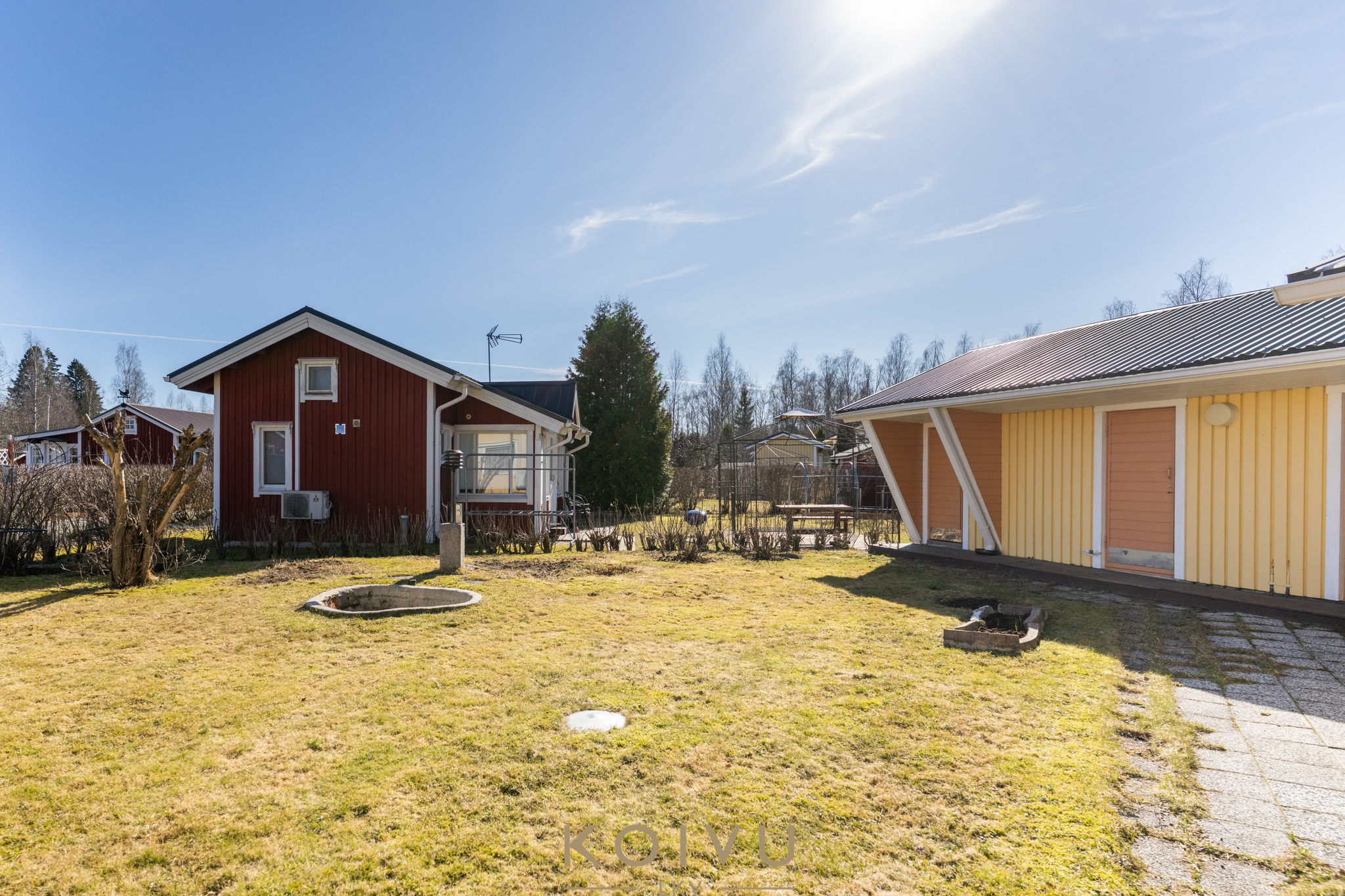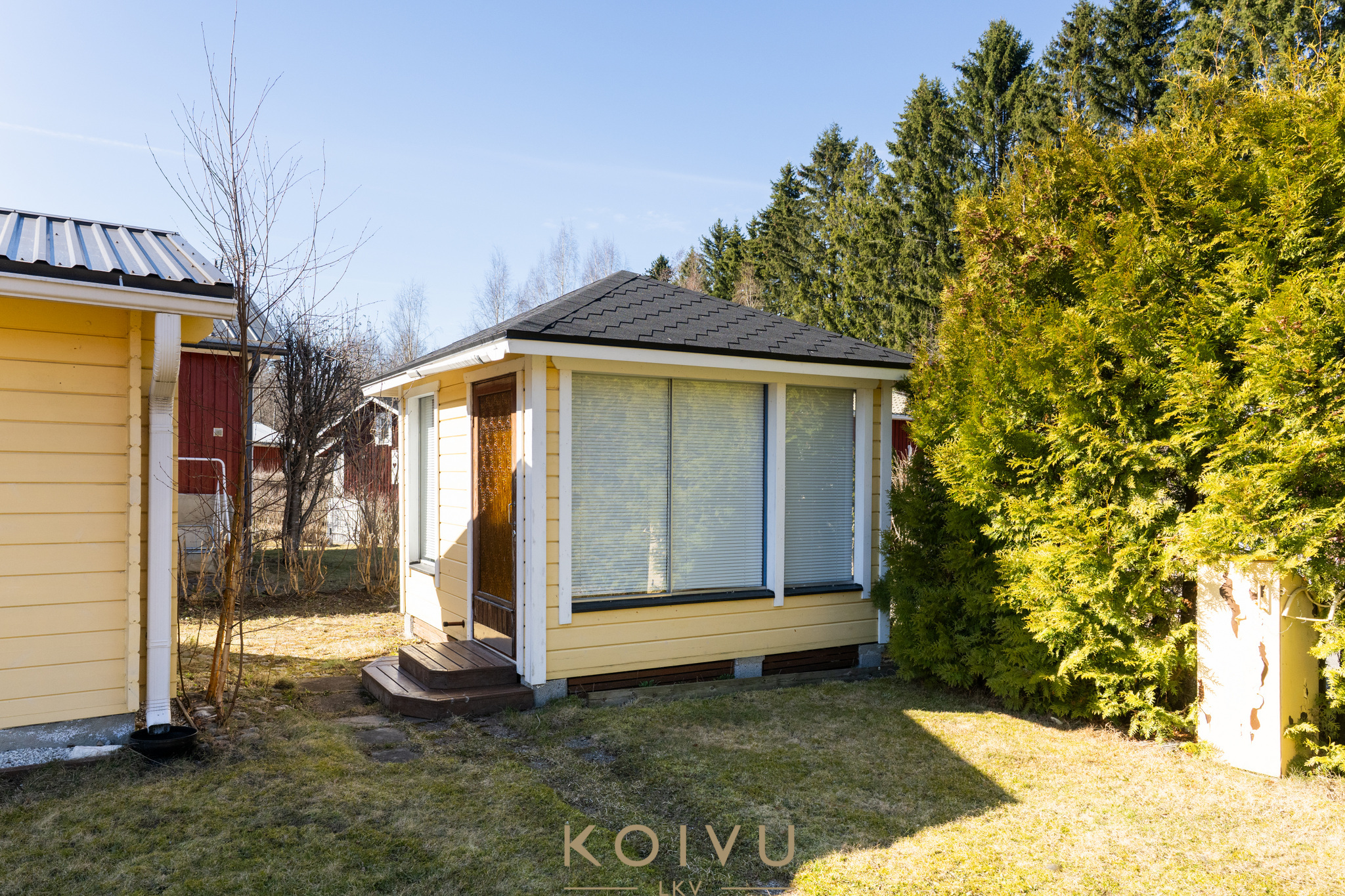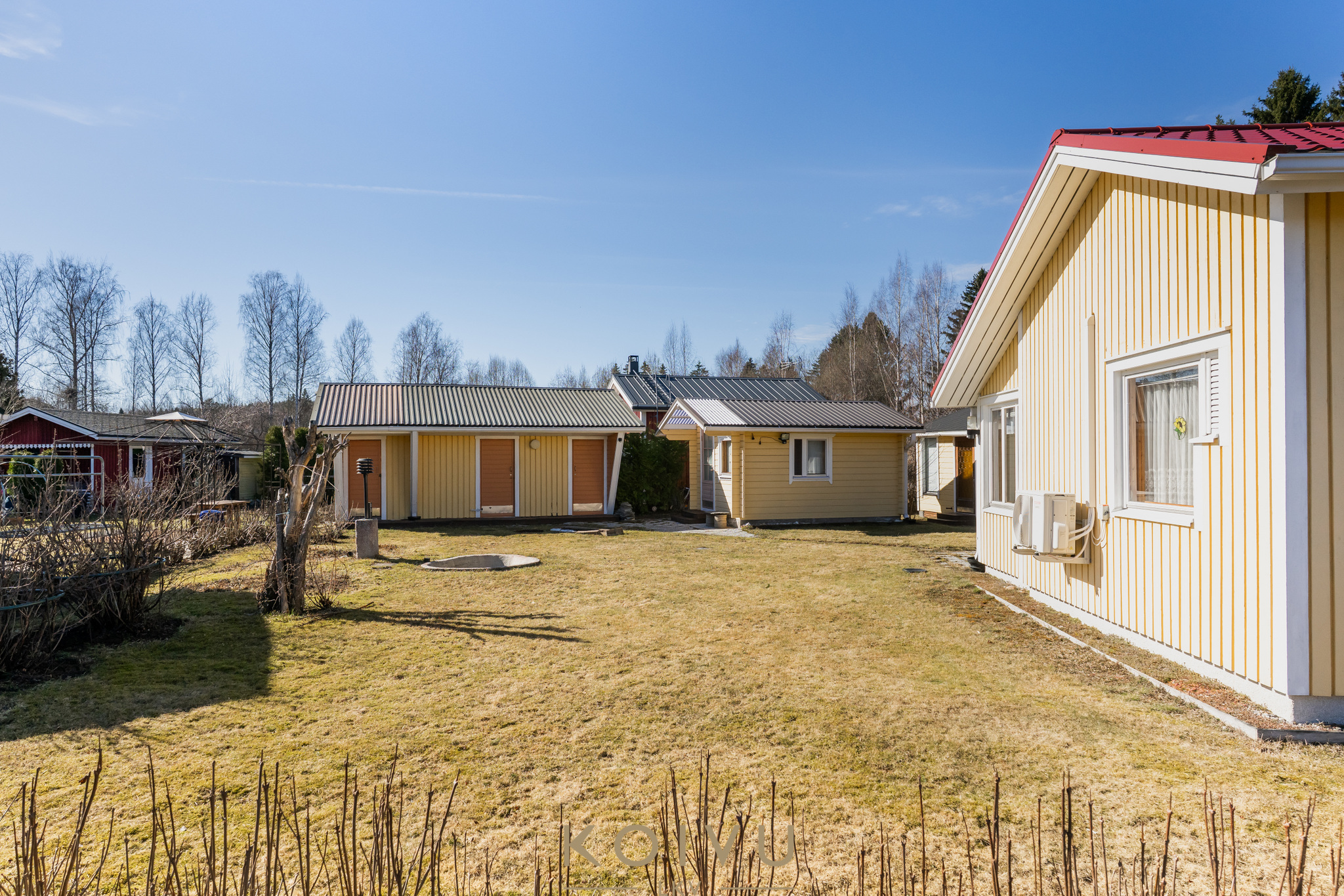 Tavanomaista tilavamman mökin lisäksi on huvimaja, vierasaitta ja 3-osainen varastorakennus.