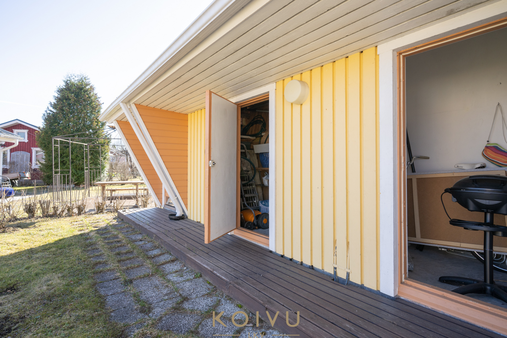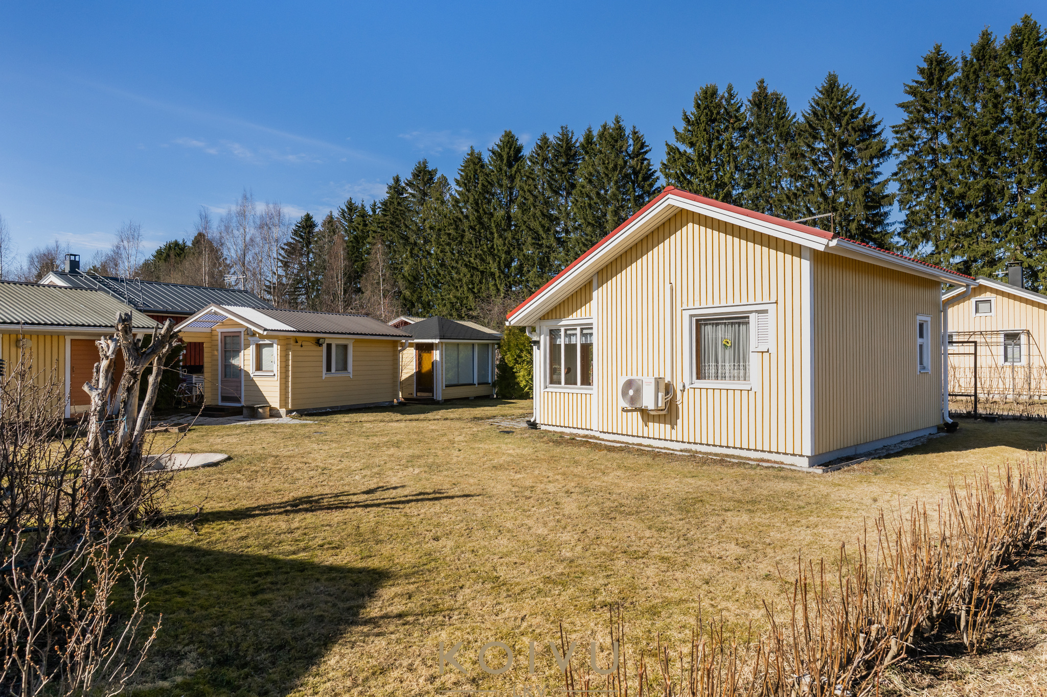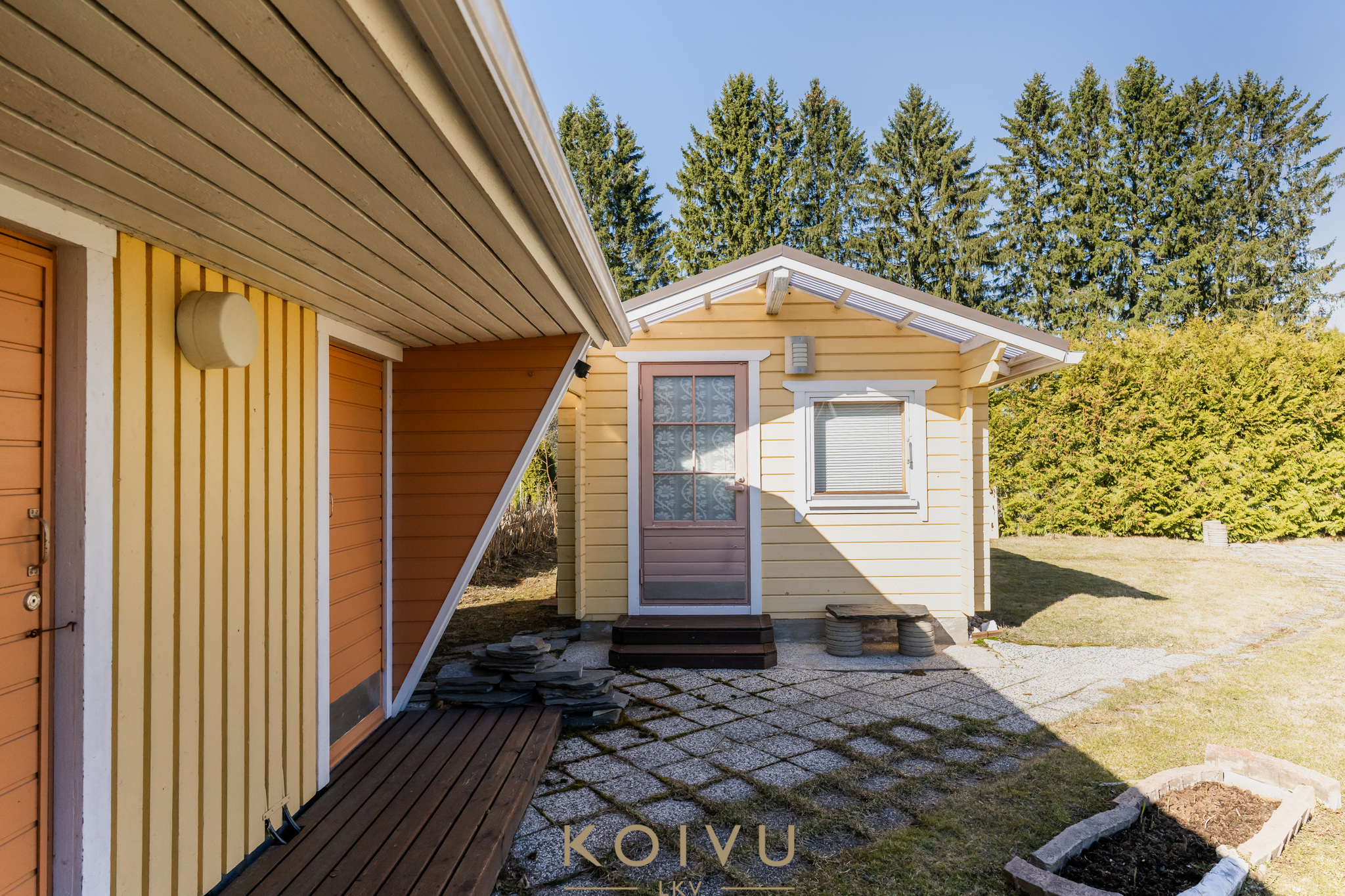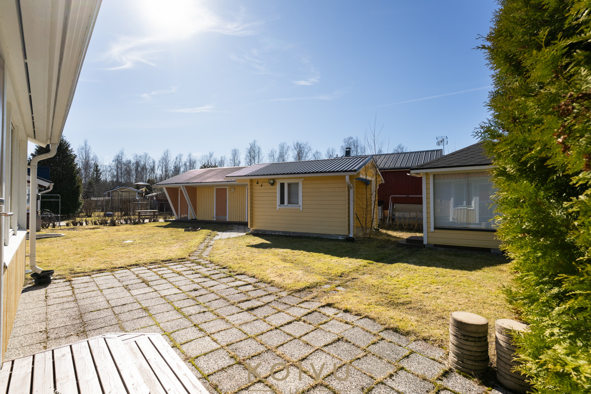 Tavanomaista tilavamman mökin lisäksi on huvimaja, vierasaitta ja 3-osainen varastorakennus.