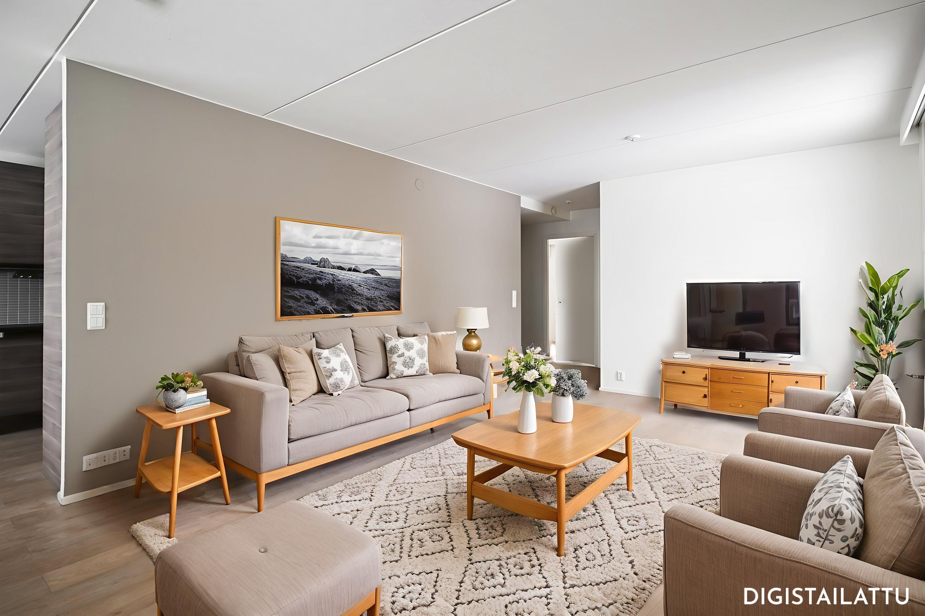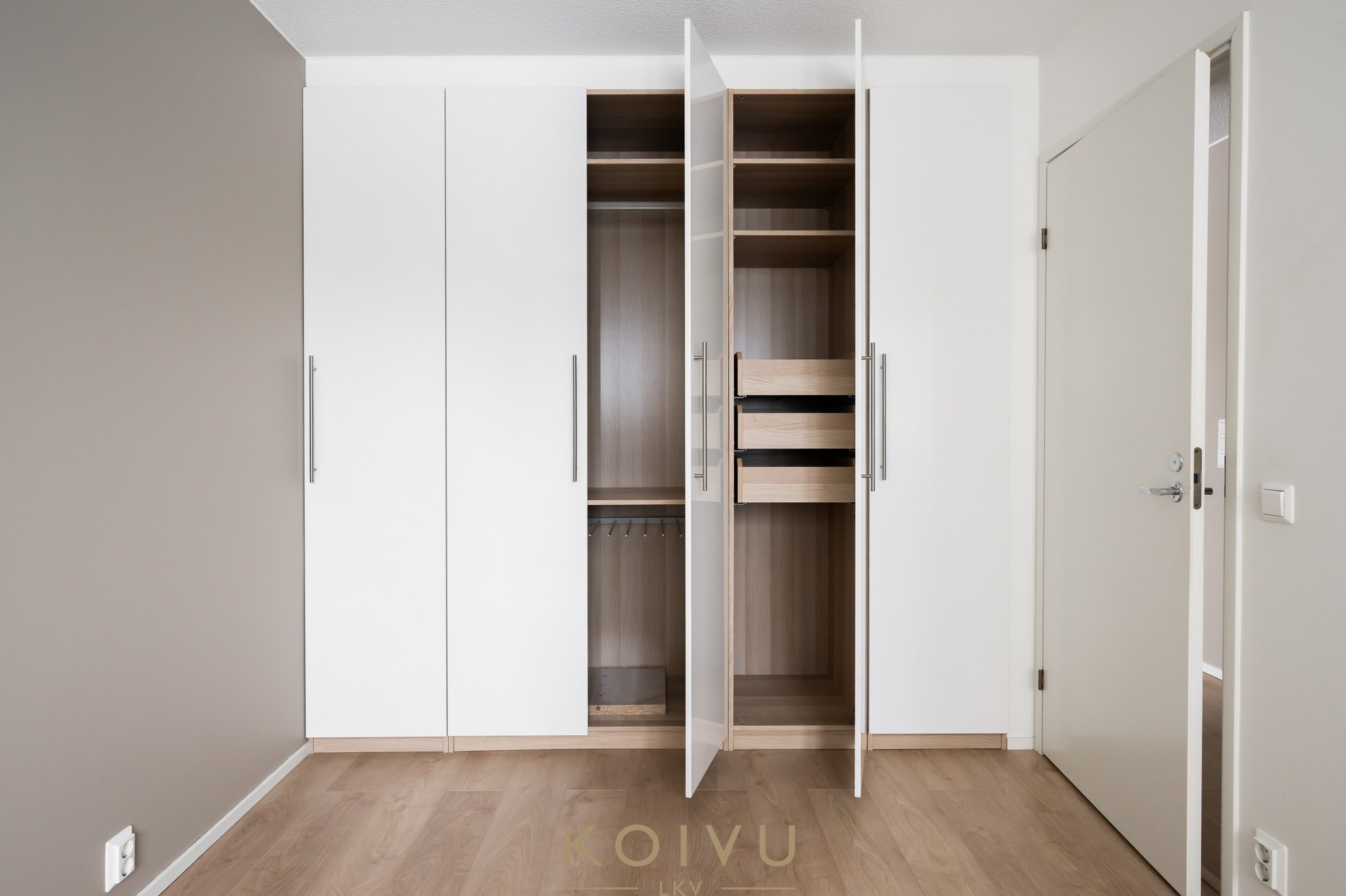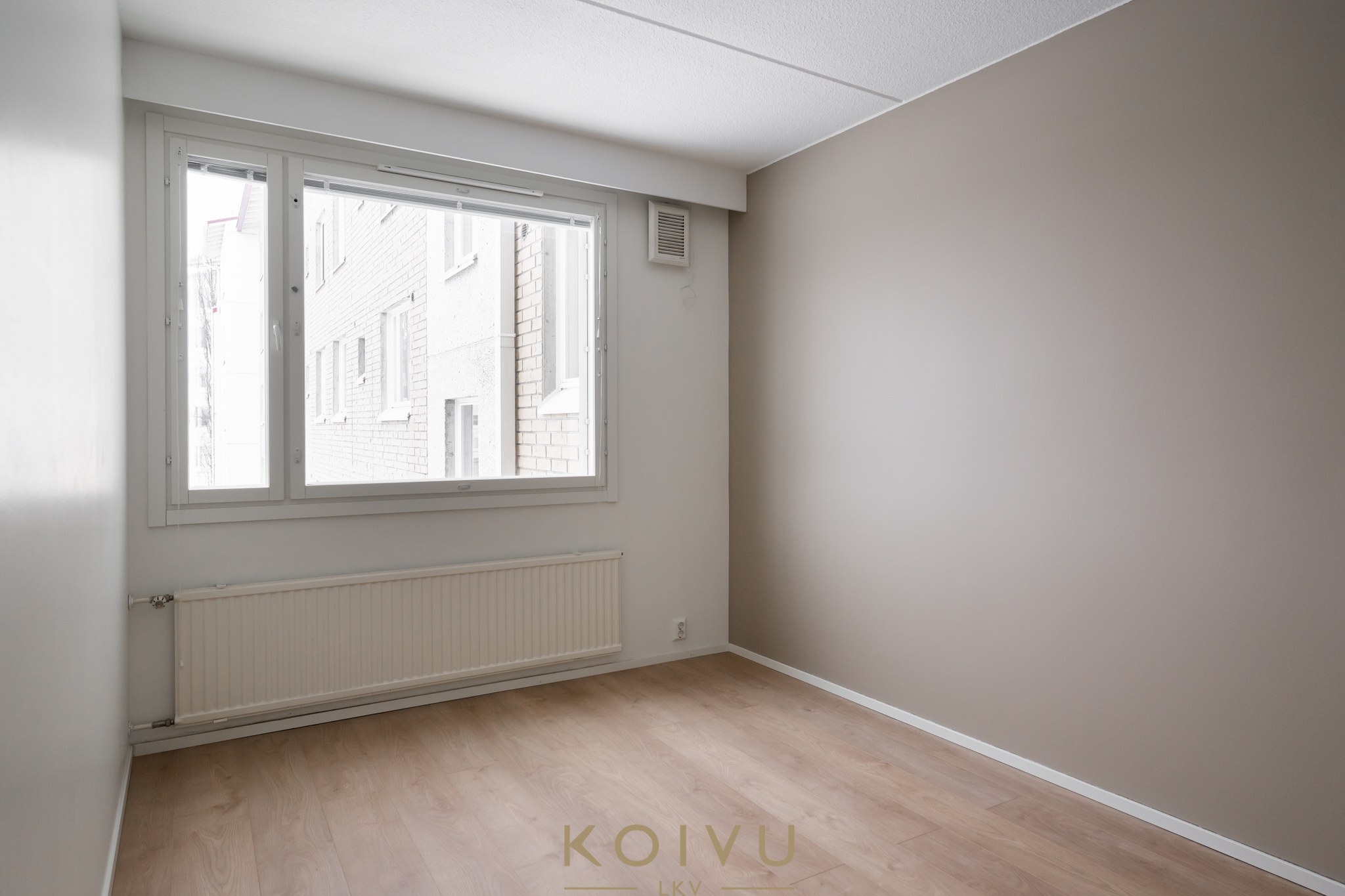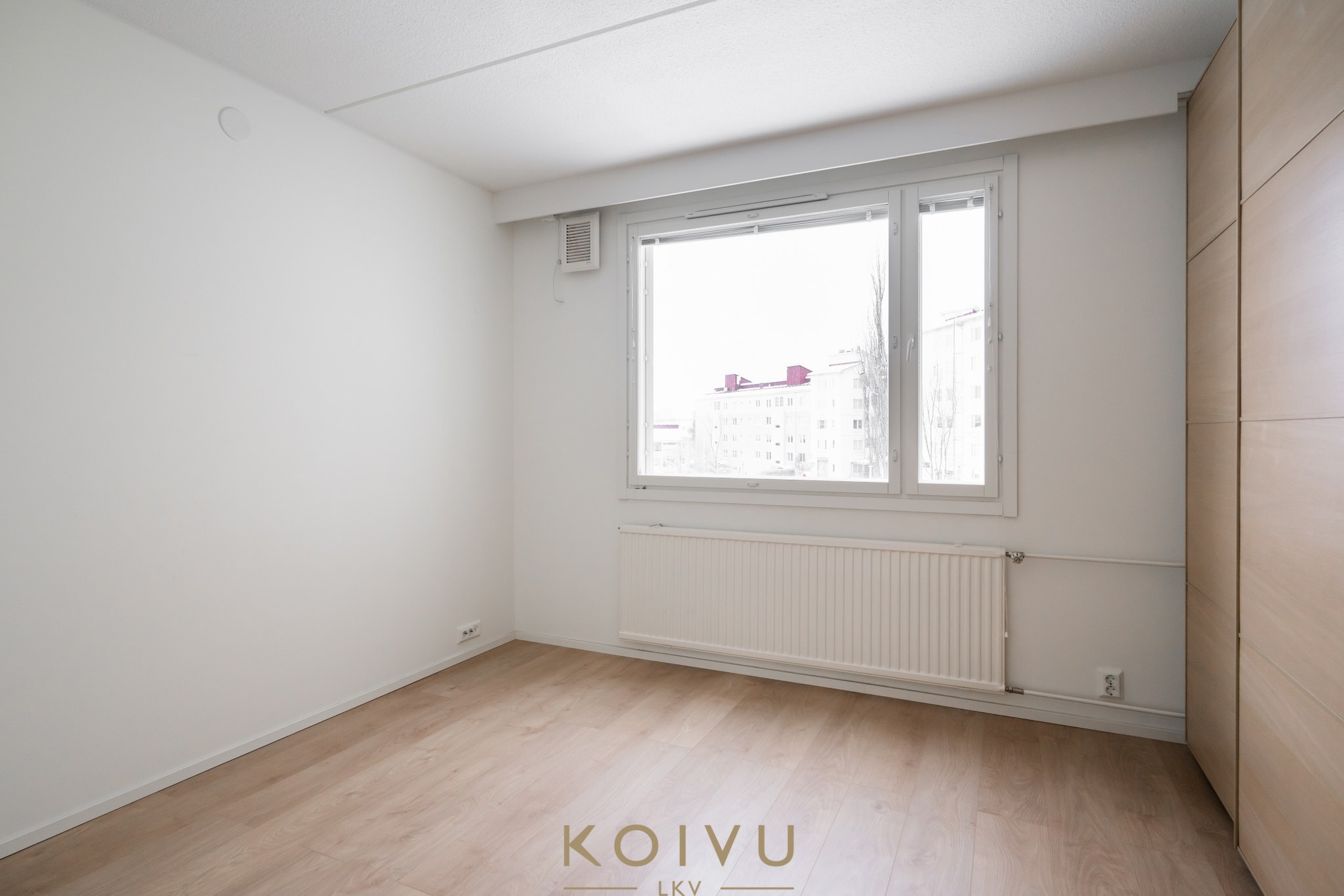 Asunnon pohjaratkaisu on avoin ja käytännöllinen. Olohuone ja keittiö muodostavat toimivan kokonaisuuden, jossa arki rullaa luontevasti. Makuuhuoneet sijoittuvat takapihan puolelle, mikä tuo lisää yksityisyyttä ja suojaa liikenteen ääniltä. Huoneet ovat hyvin kalustettavissa, ja säilytystilat ovat yksi kodin vahvuuksista – kaappitilaa on reilusti ja arki pysyy järjestyksessä.