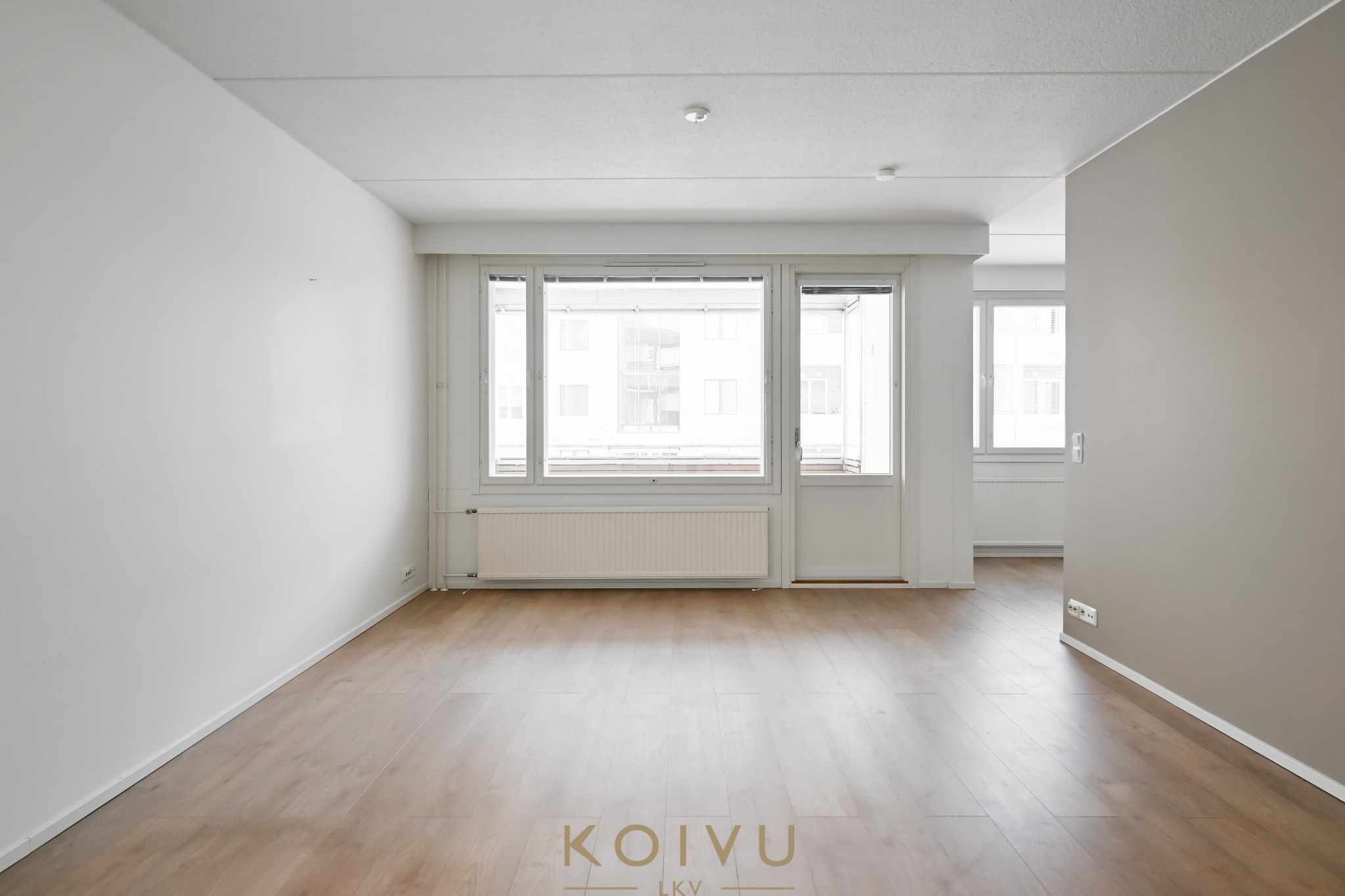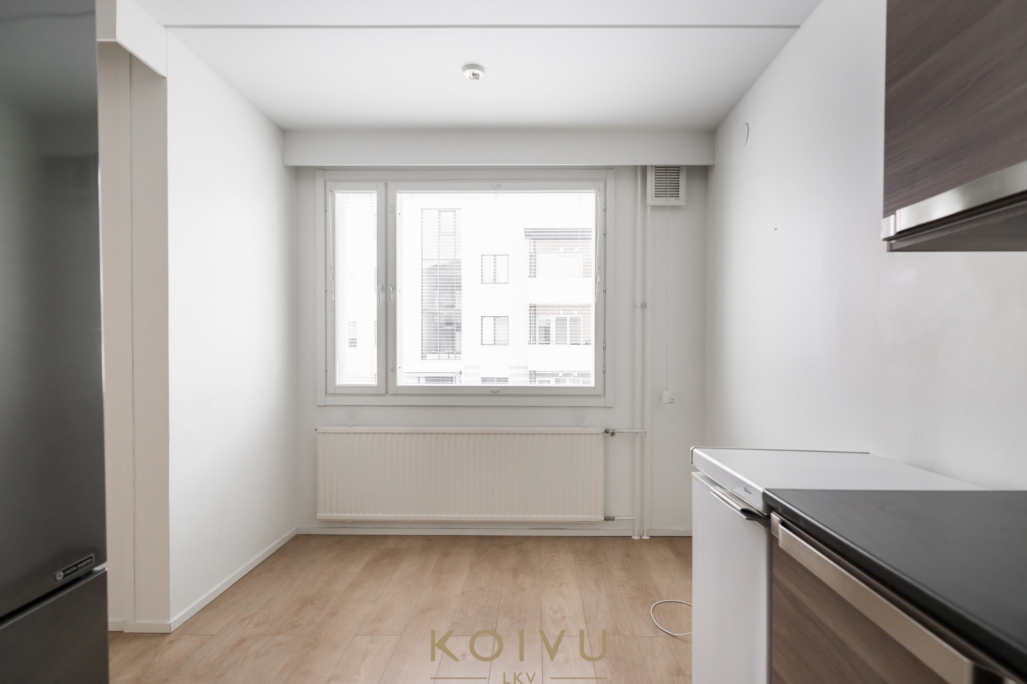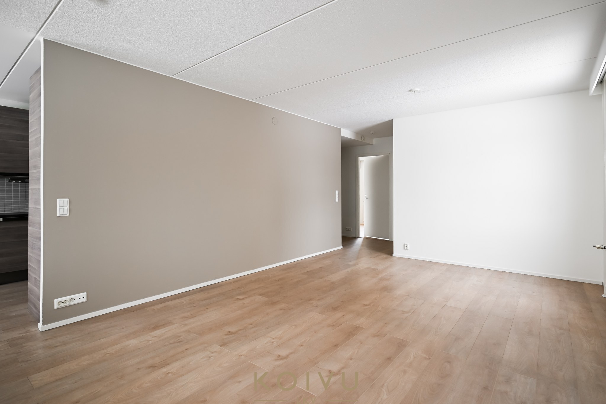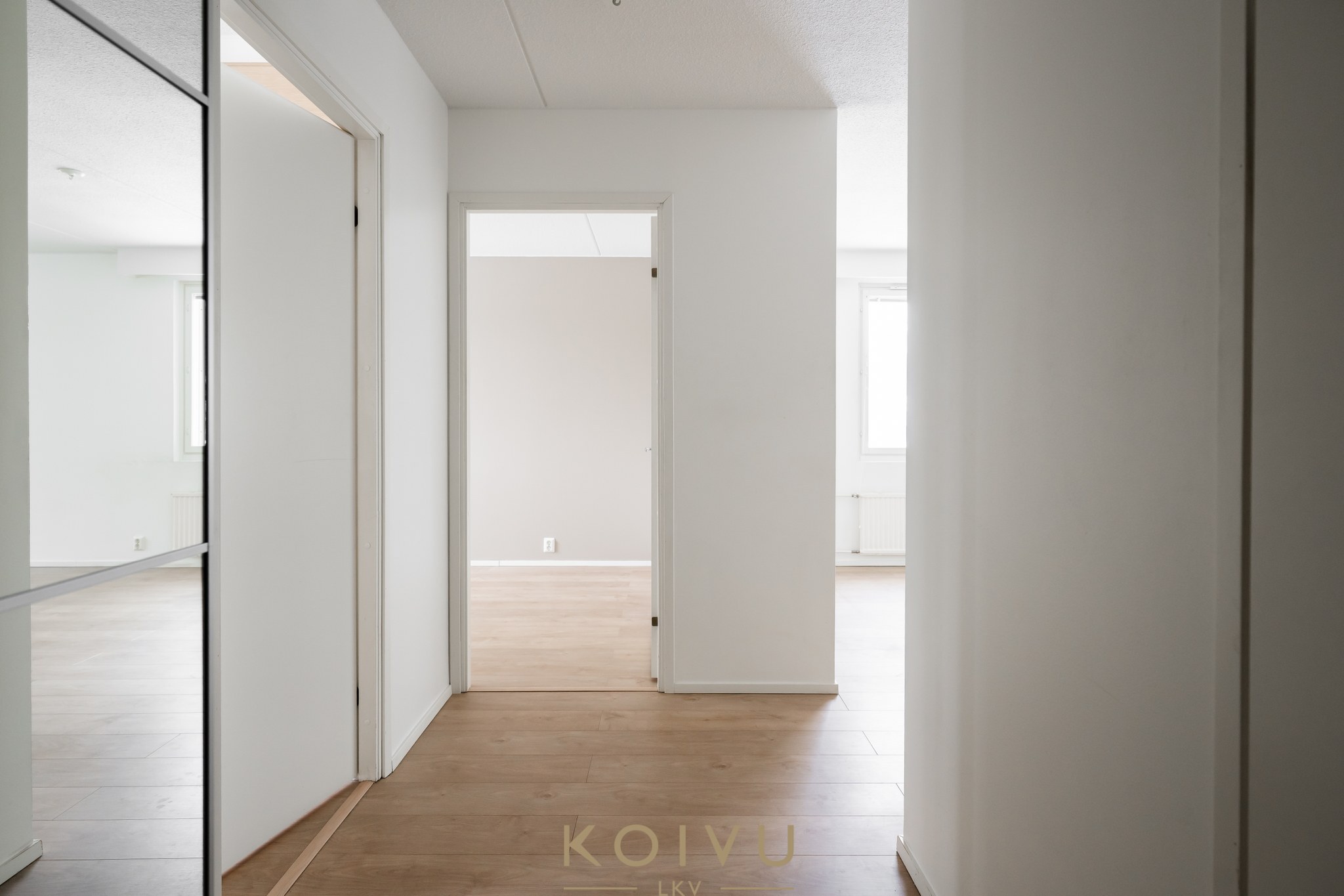 Asunnon pohjaratkaisu on avoin ja käytännöllinen. Olohuone ja keittiö muodostavat toimivan kokonaisuuden, jossa arki rullaa luontevasti. Makuuhuoneet sijoittuvat takapihan puolelle, mikä tuo lisää yksityisyyttä ja suojaa liikenteen ääniltä. Huoneet ovat hyvin kalustettavissa, ja säilytystilat ovat yksi kodin vahvuuksista – kaappitilaa on reilusti ja arki pysyy järjestyksessä.