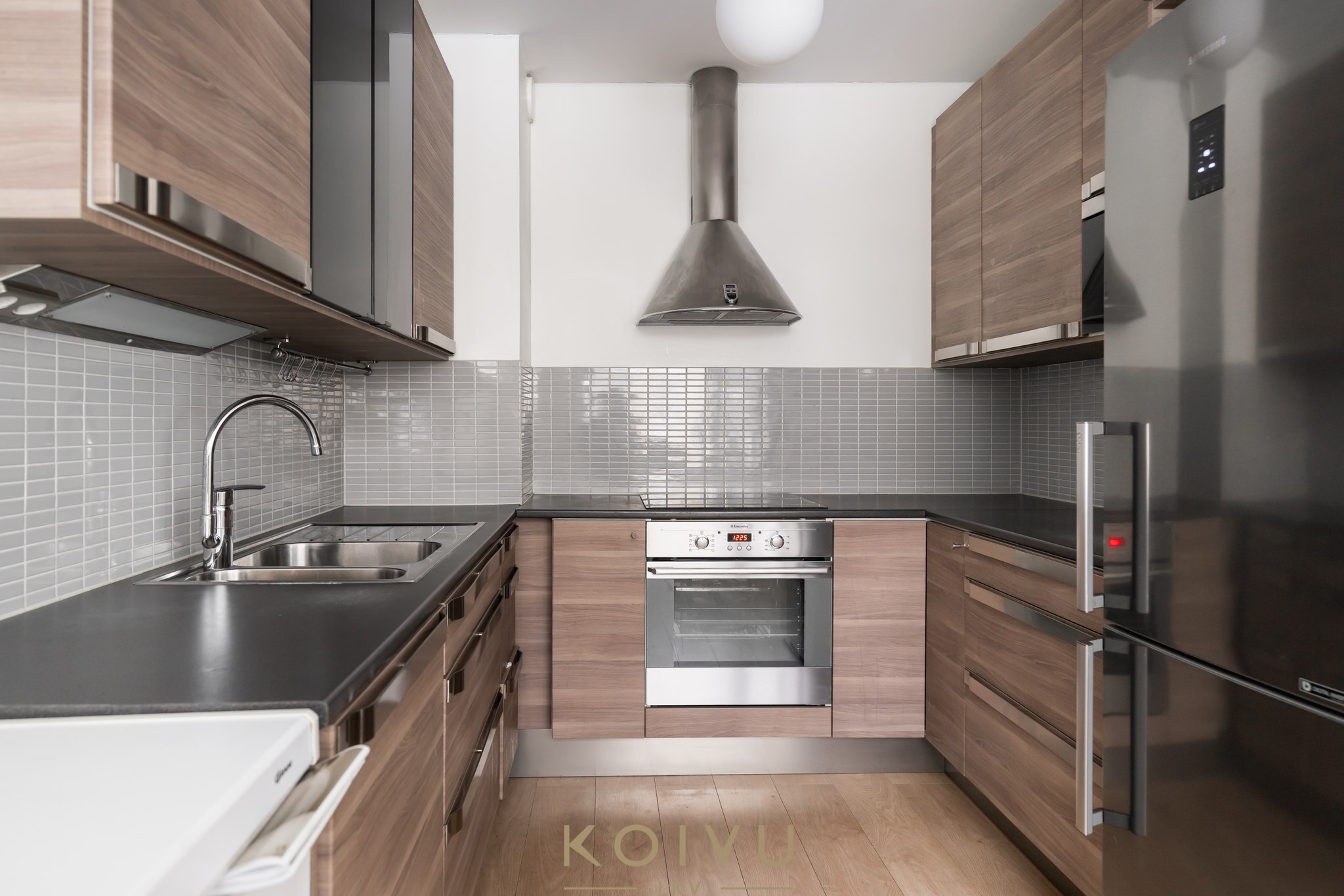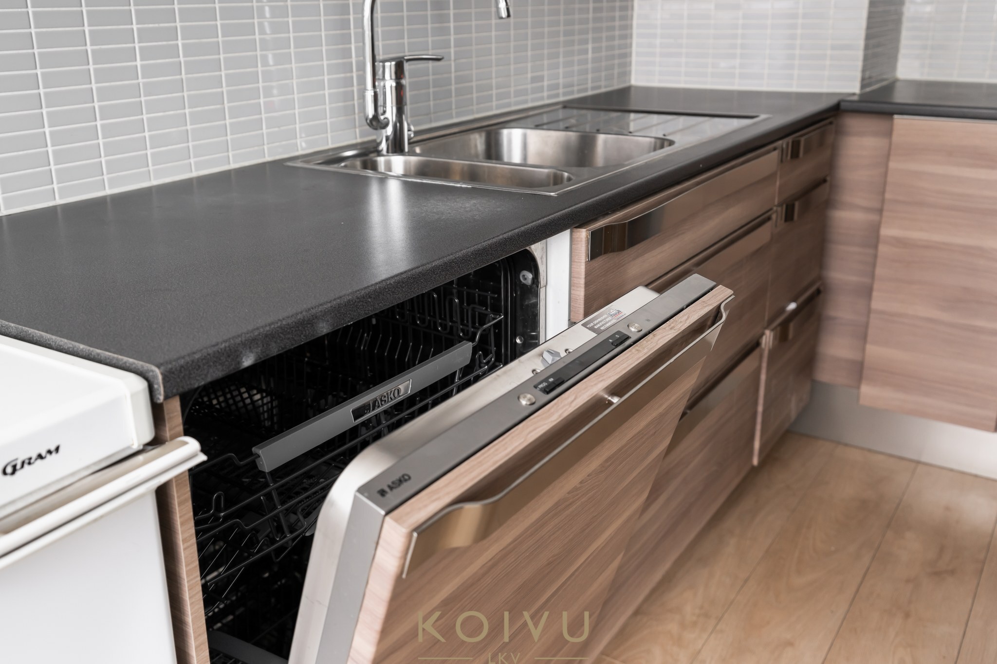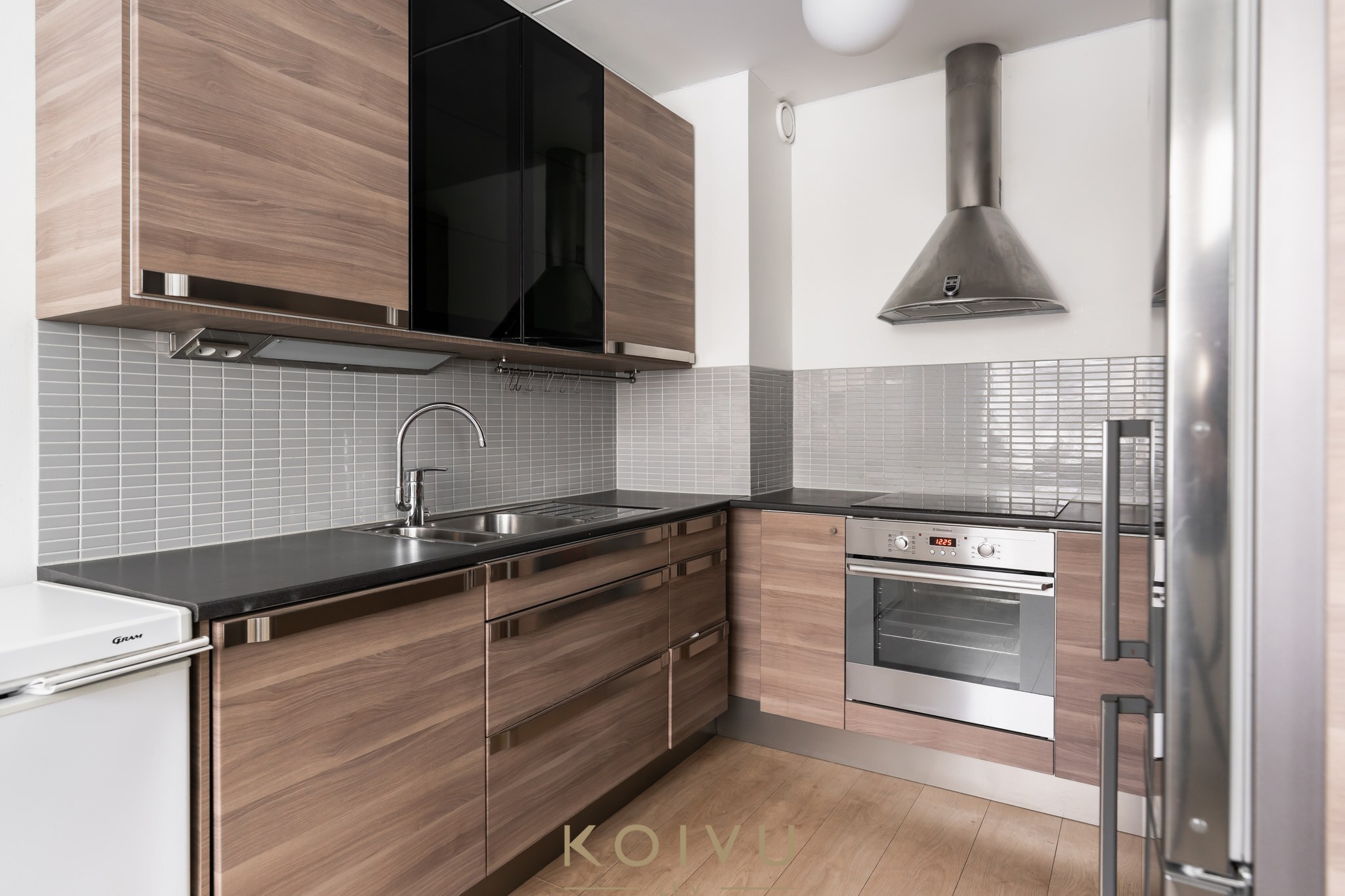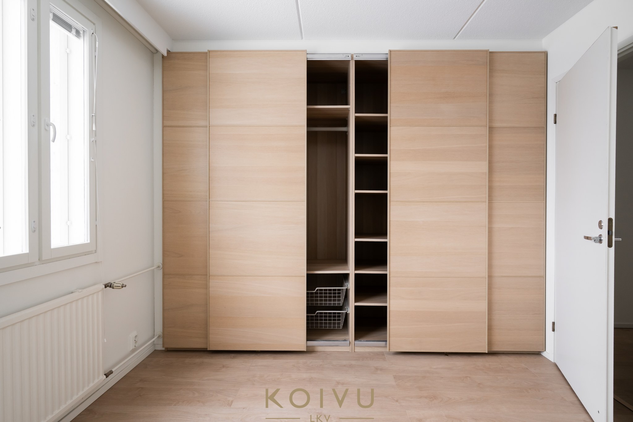 Asunnon pohjaratkaisu on avoin ja käytännöllinen. Olohuone ja keittiö muodostavat toimivan kokonaisuuden, jossa arki rullaa luontevasti. Makuuhuoneet sijoittuvat takapihan puolelle, mikä tuo lisää yksityisyyttä ja suojaa liikenteen ääniltä. Huoneet ovat hyvin kalustettavissa, ja säilytystilat ovat yksi kodin vahvuuksista – kaappitilaa on reilusti ja arki pysyy järjestyksessä.