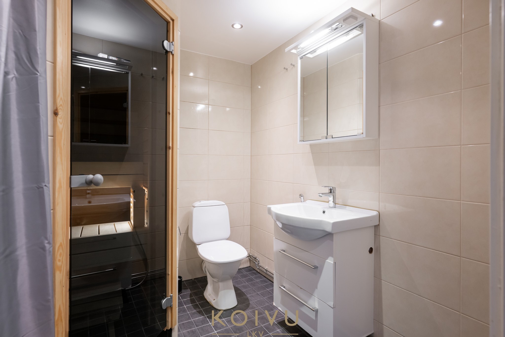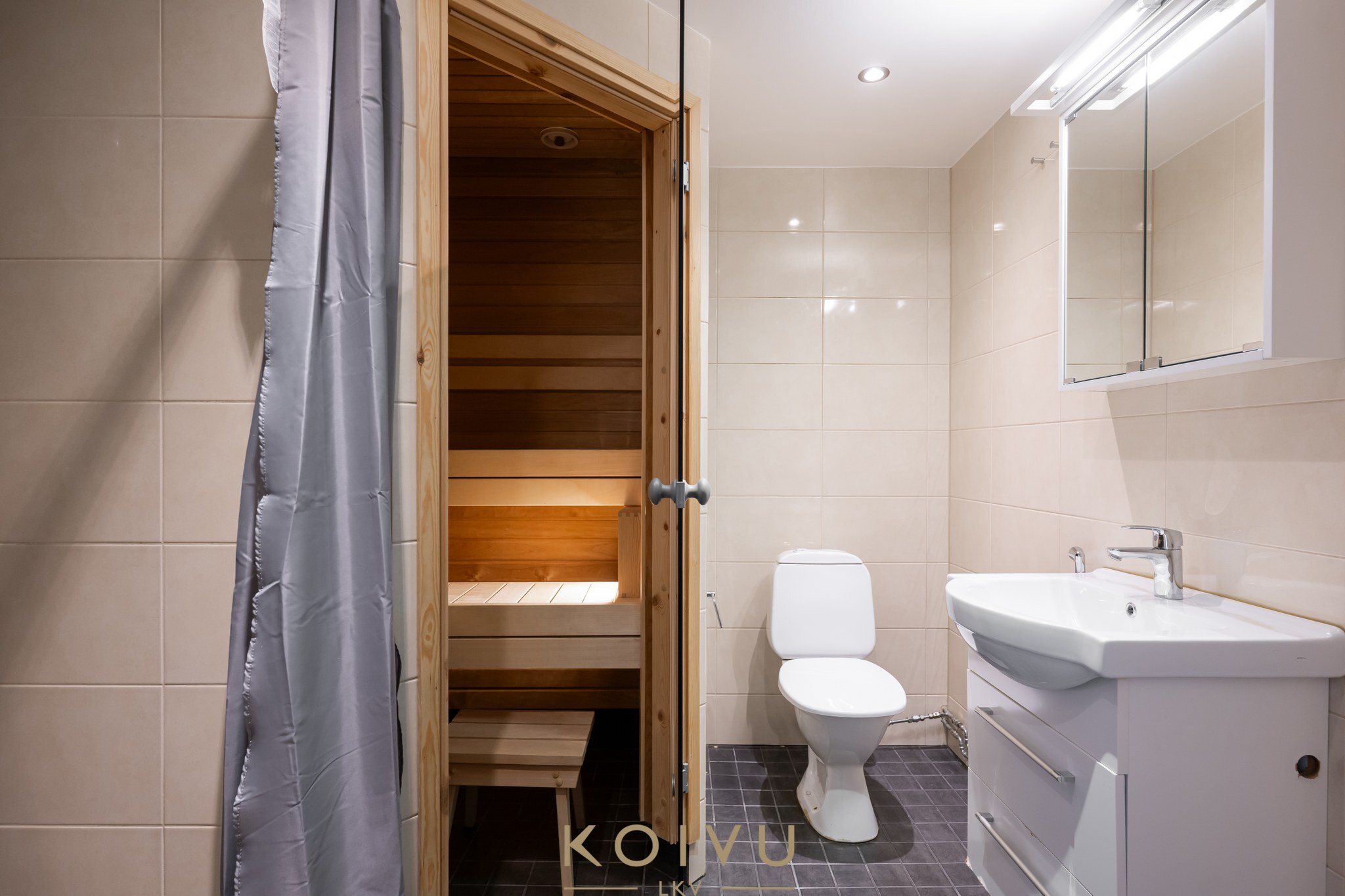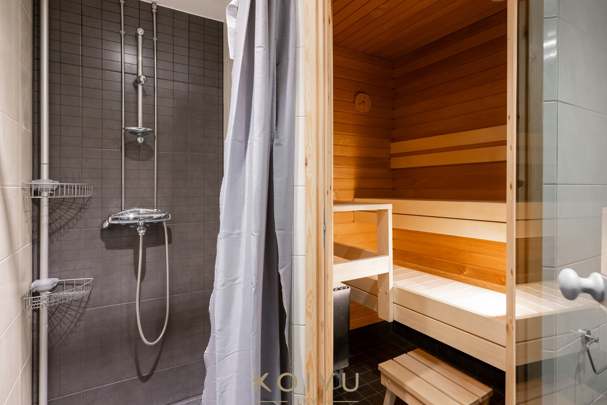 Kylpyhuone ja oma sauna lisäävät asumismukavuutta. Lasitettu parveke on viimeistelty kauniilla paneloinnilla, ja se toimii aidosti lisätilana suuren osan vuodesta.