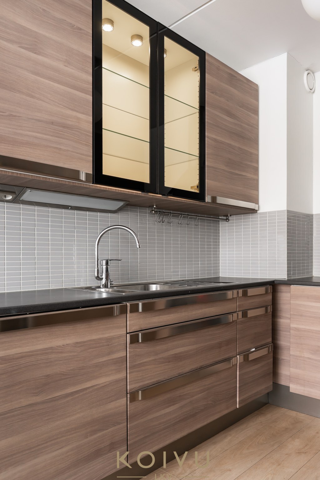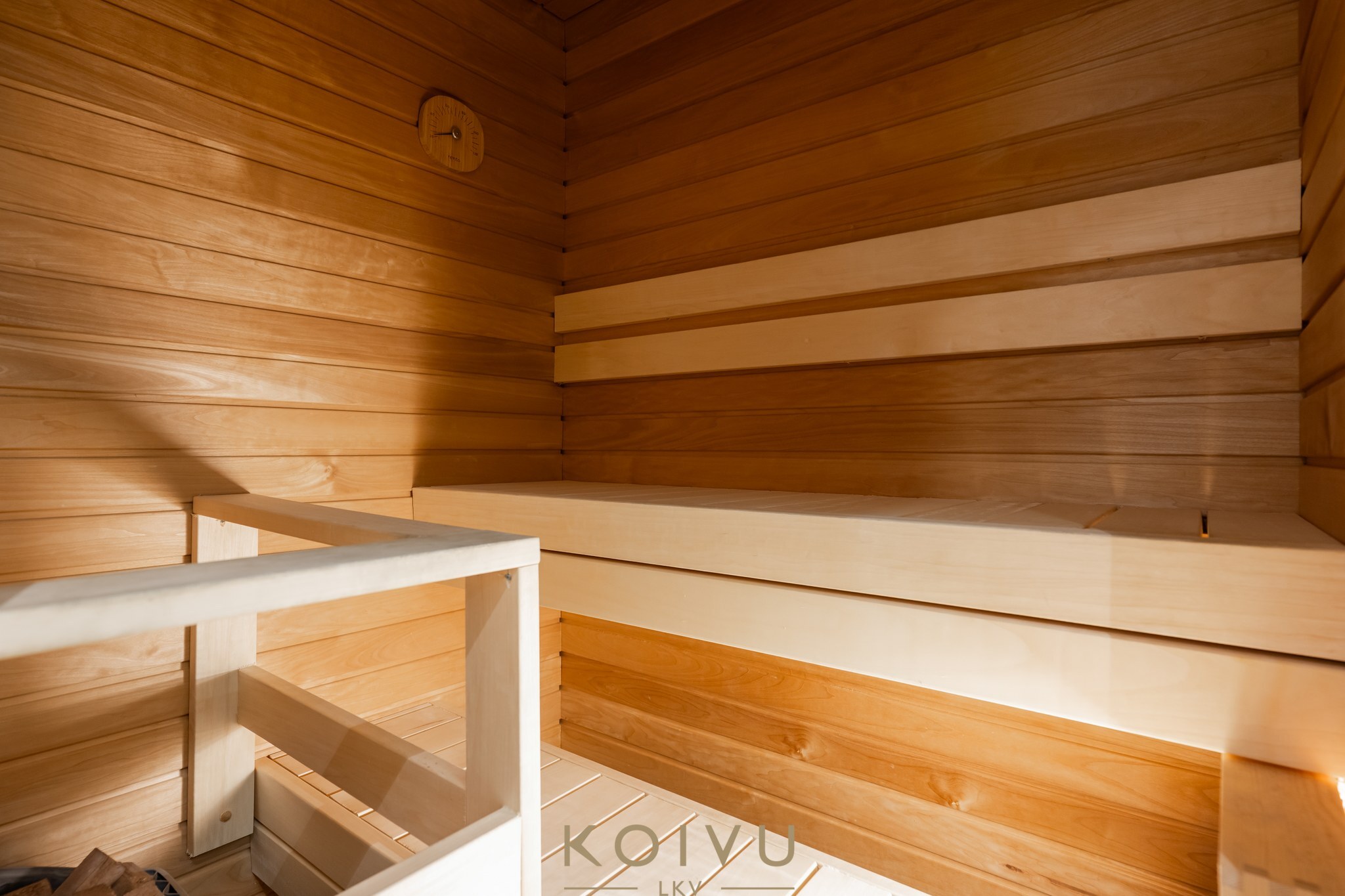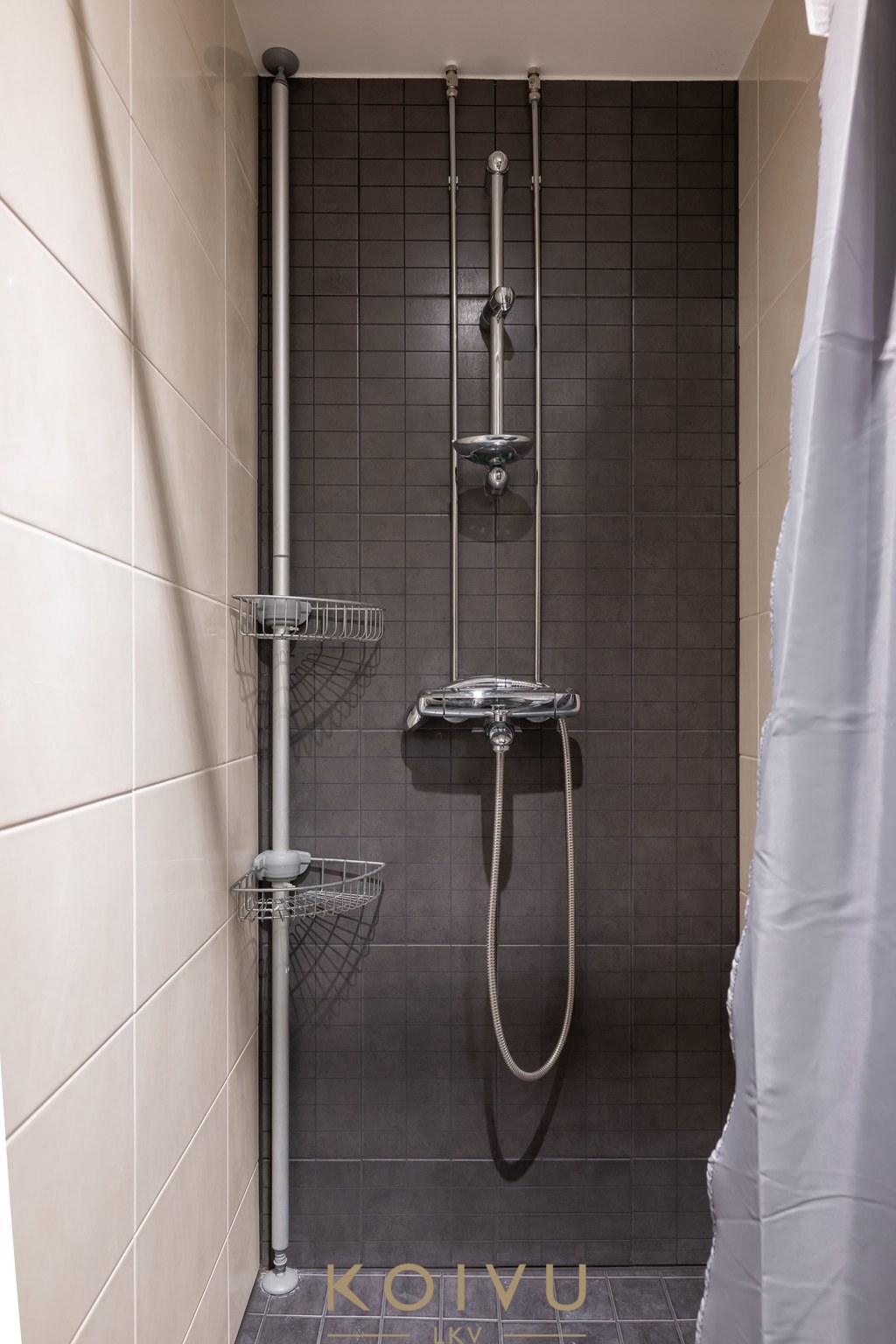 Kylpyhuone ja oma sauna lisäävät asumismukavuutta. Lasitettu parveke on viimeistelty kauniilla paneloinnilla, ja se toimii aidosti lisätilana suuren osan vuodesta.