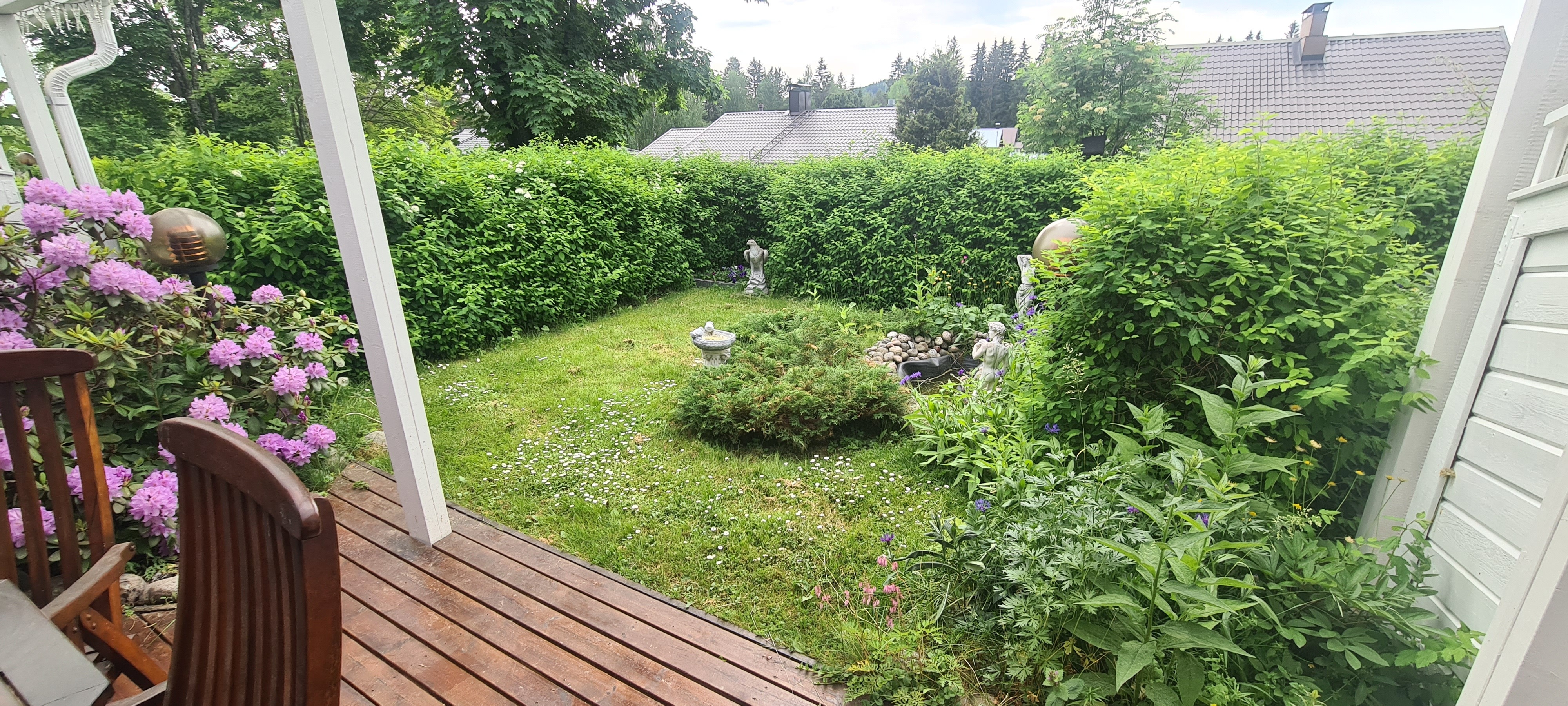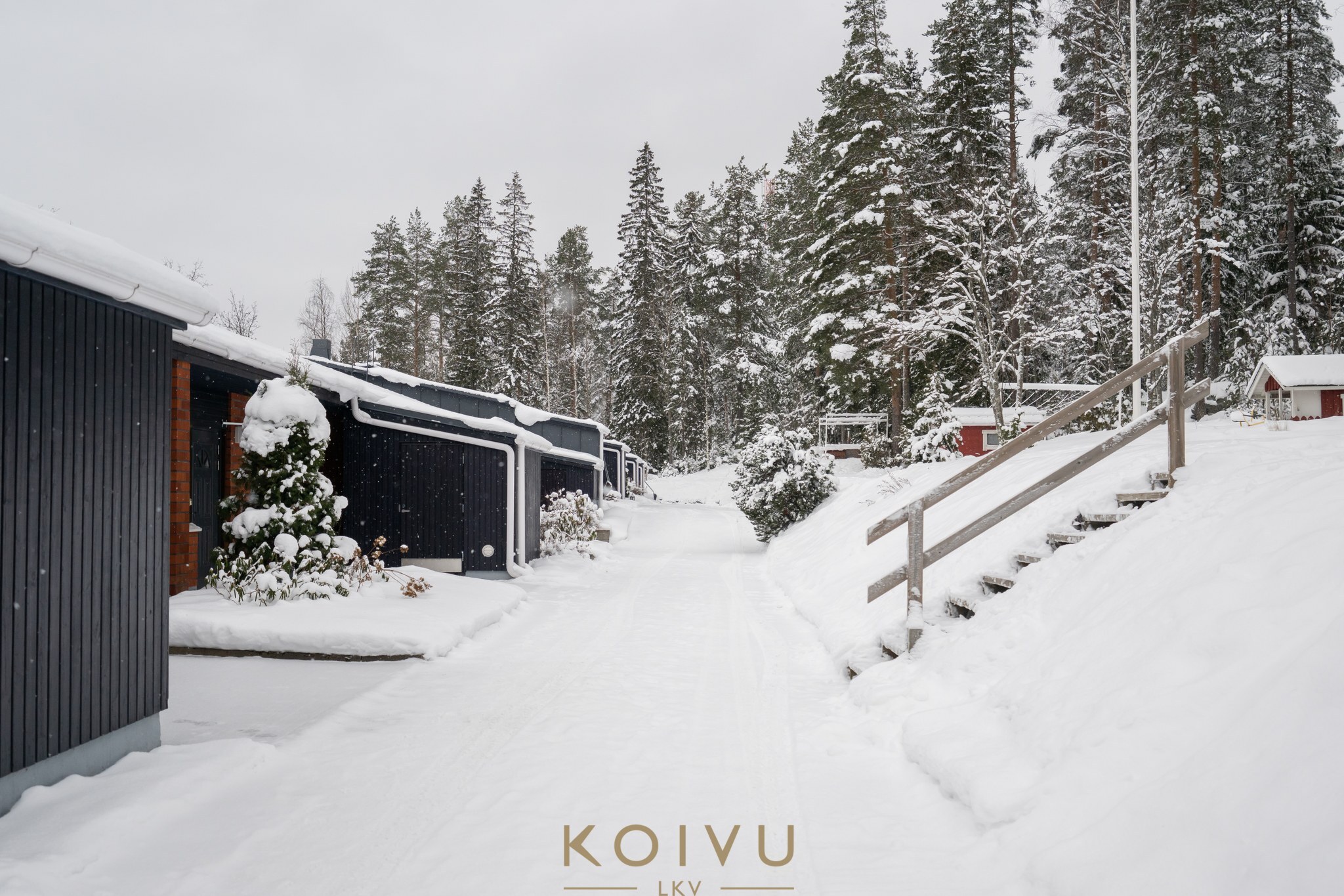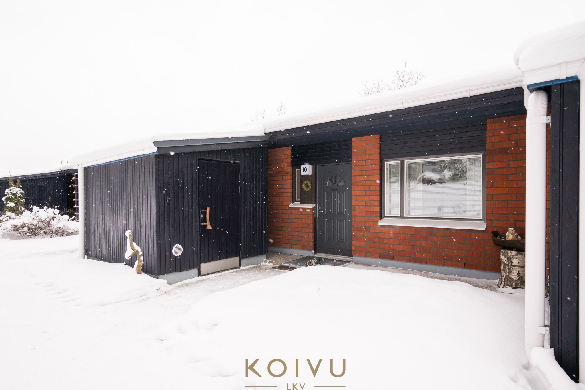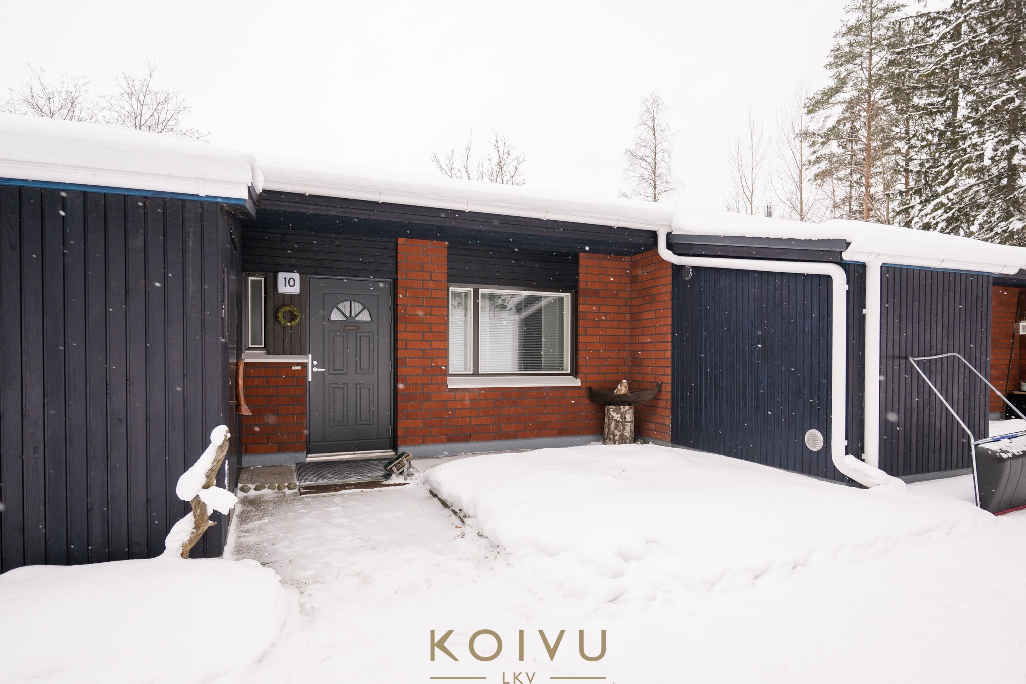 Keljonkankaan ytimestä omatonttinen rivitalokaksio, joka sijaitsee pienen mäen päällä ja tontti rajoittuu metsään takapuolelta.