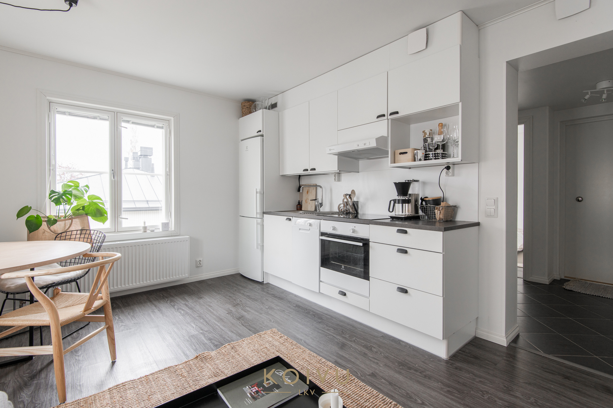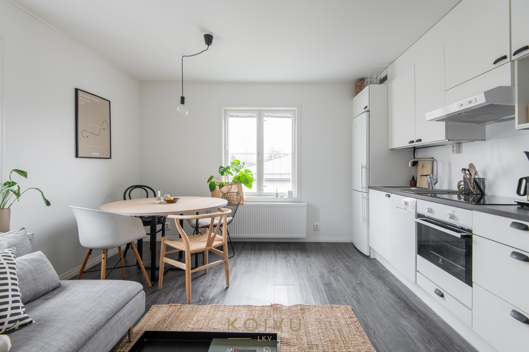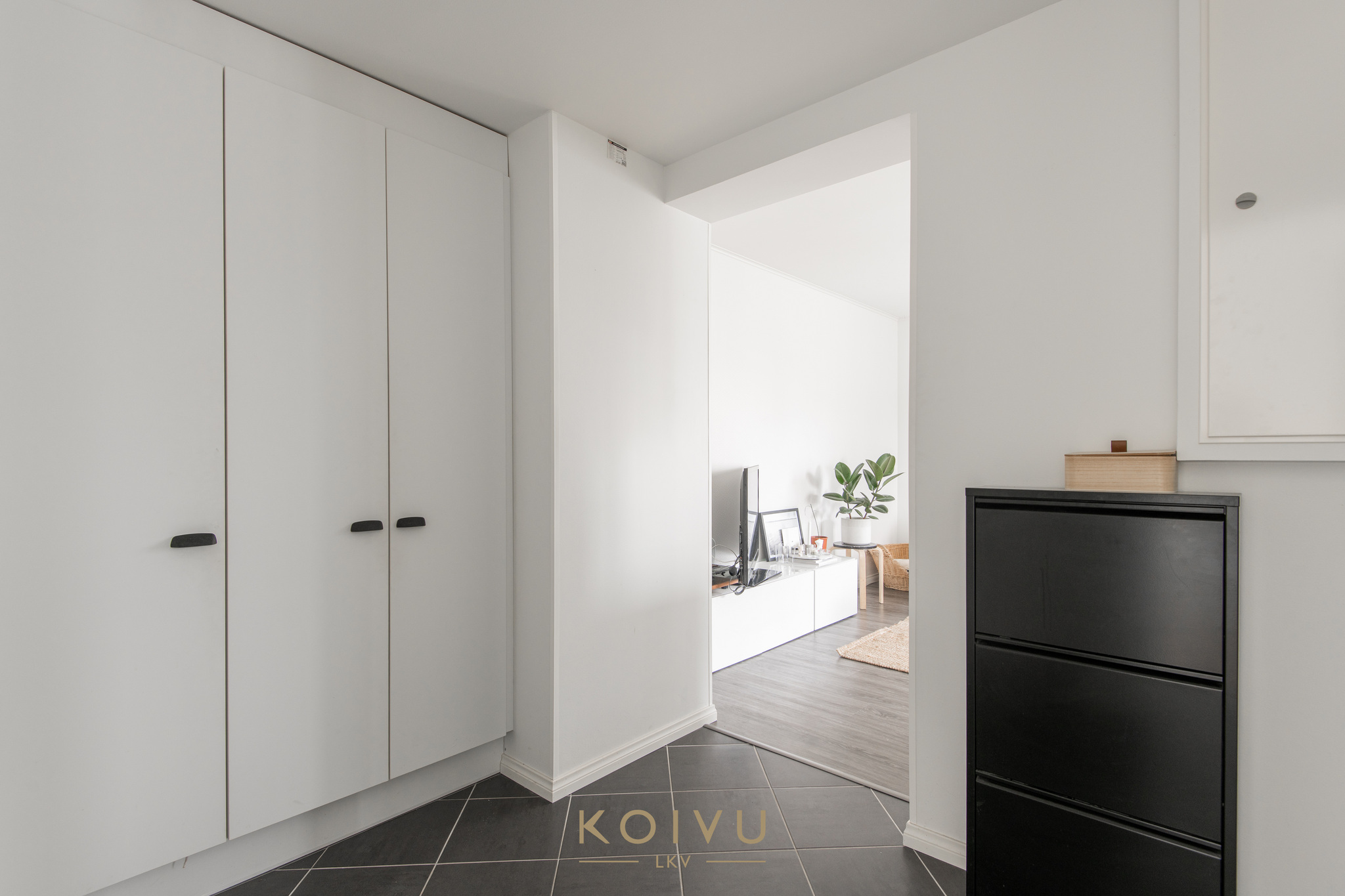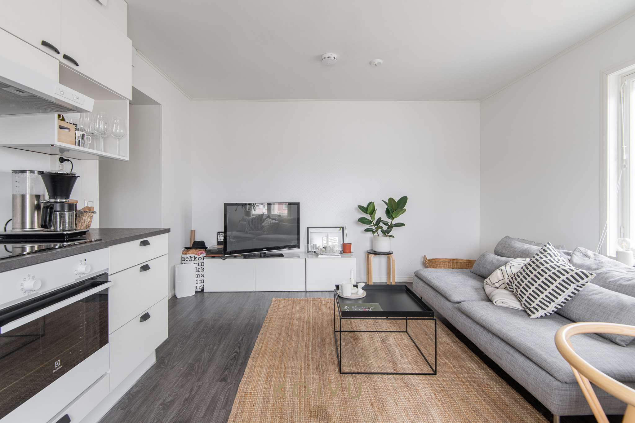 Keittiö ja olohuone muodostavat selkeän ja helposti kalustettavan kokonaisuuden. Erillinen makuuhuone tuo arkeen toimivuutta, ja eteisen kaapistot lisäävät säilytystilaa. Yleisilme on vaalea, selkeä ja helposti lähestyttävä.