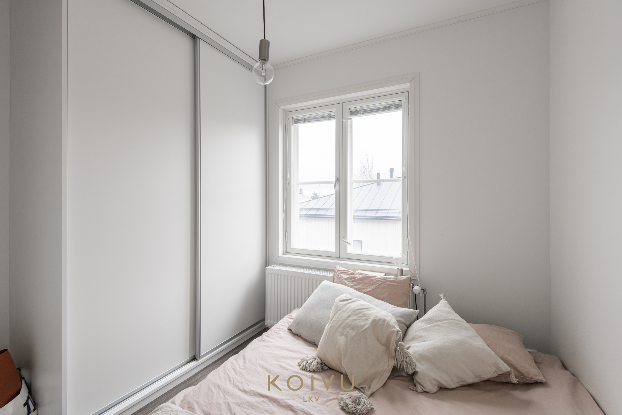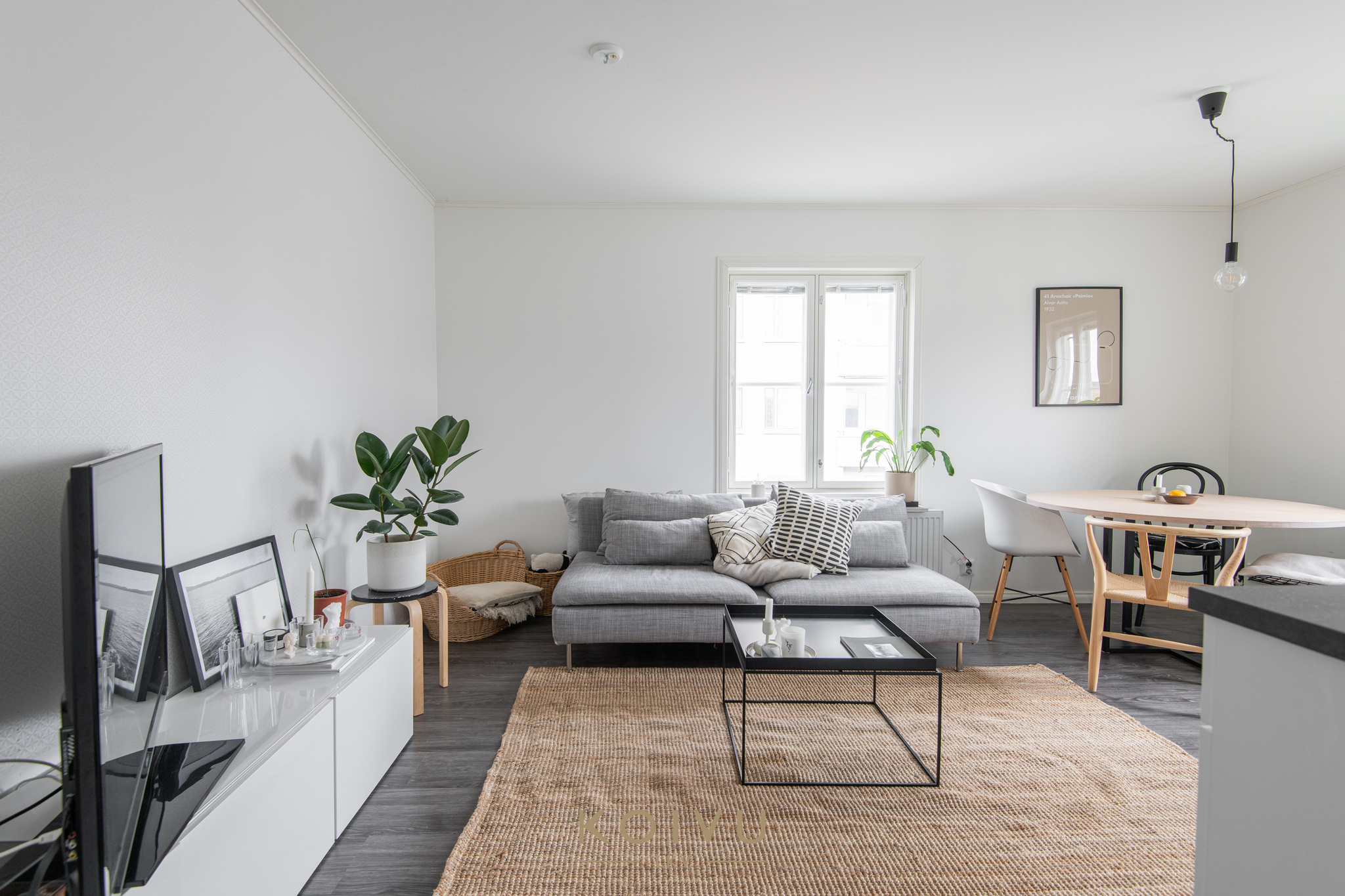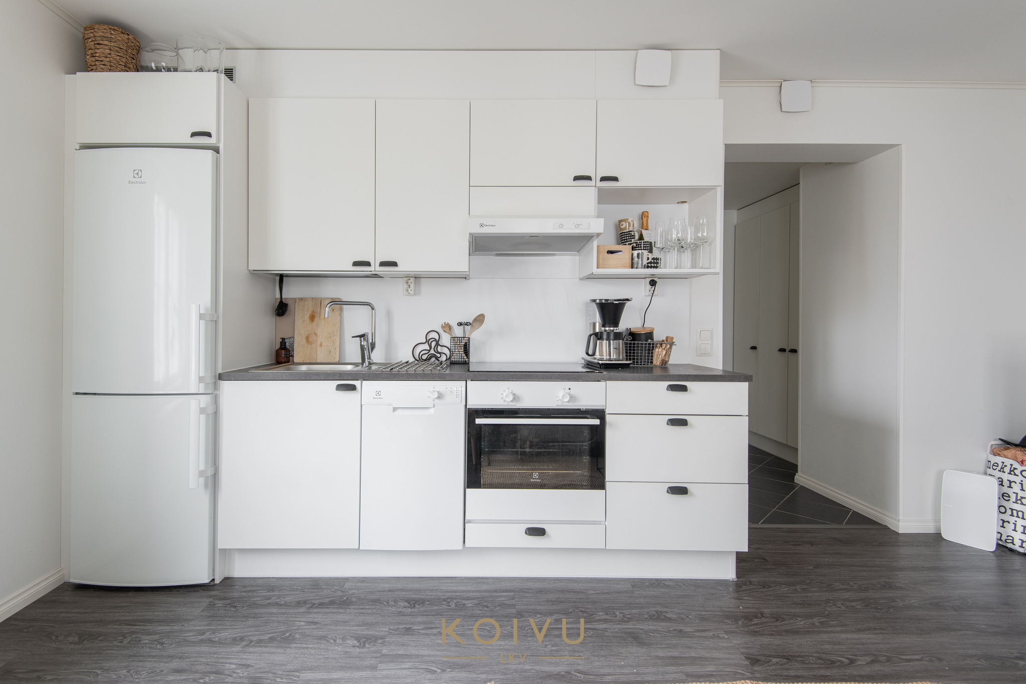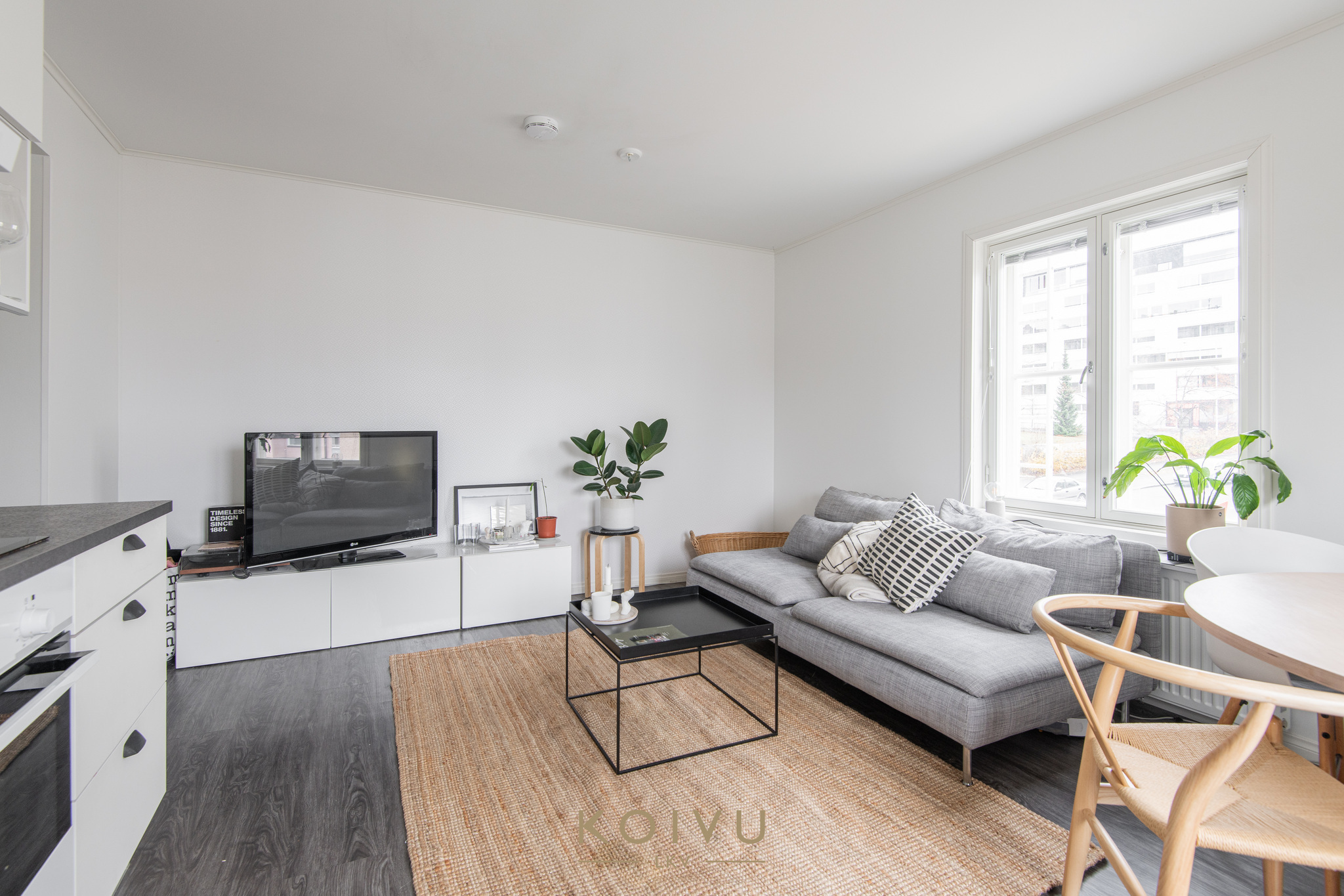 Keittiö ja olohuone muodostavat selkeän ja helposti kalustettavan kokonaisuuden. Erillinen makuuhuone tuo arkeen toimivuutta, ja eteisen kaapistot lisäävät säilytystilaa. Yleisilme on vaalea, selkeä ja helposti lähestyttävä.