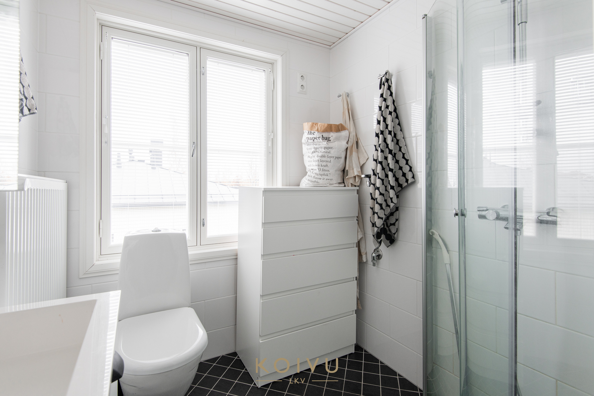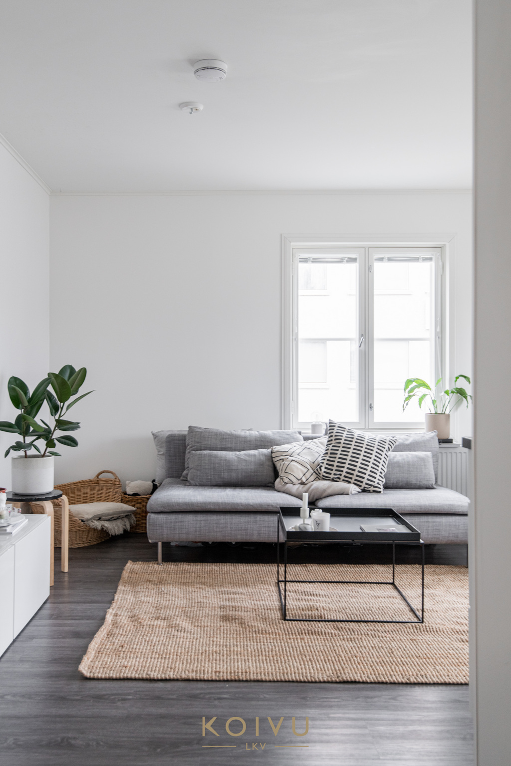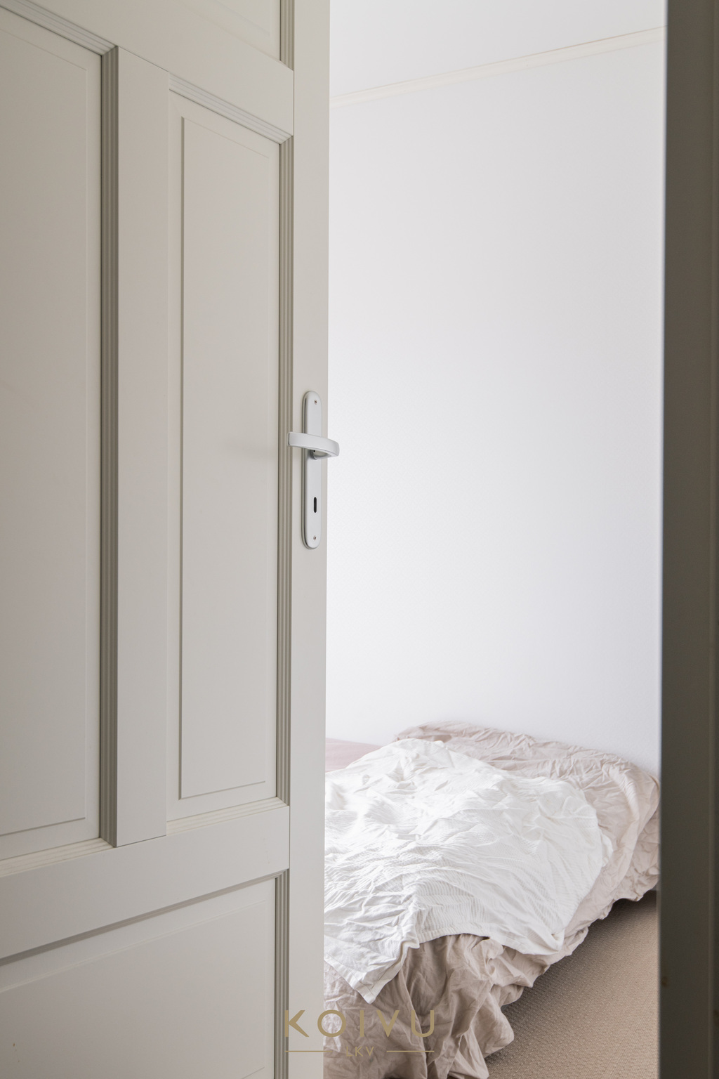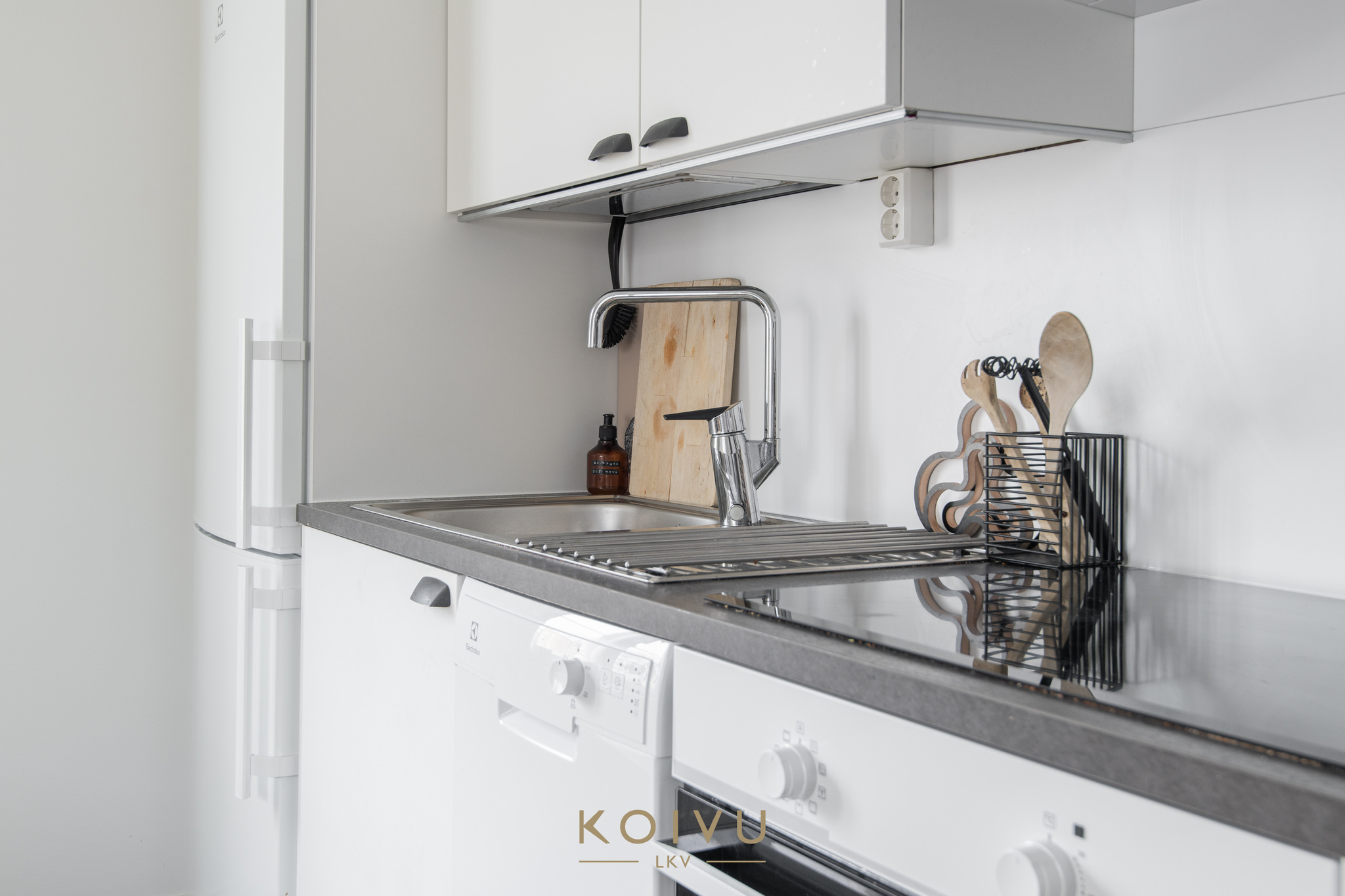 Keittiö ja olohuone muodostavat selkeän ja helposti kalustettavan kokonaisuuden. Erillinen makuuhuone tuo arkeen toimivuutta, ja eteisen kaapistot lisäävät säilytystilaa. Yleisilme on vaalea, selkeä ja helposti lähestyttävä.