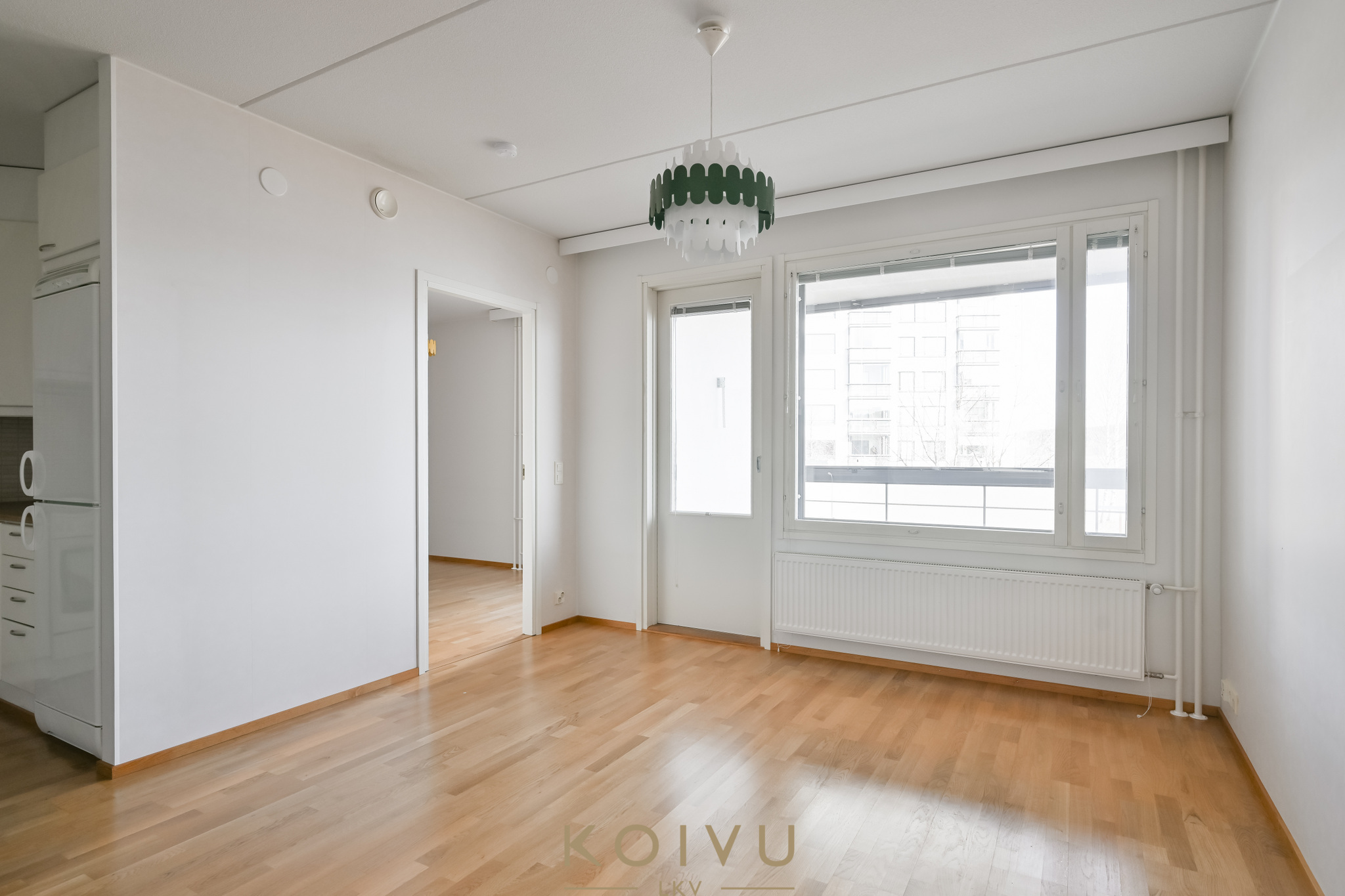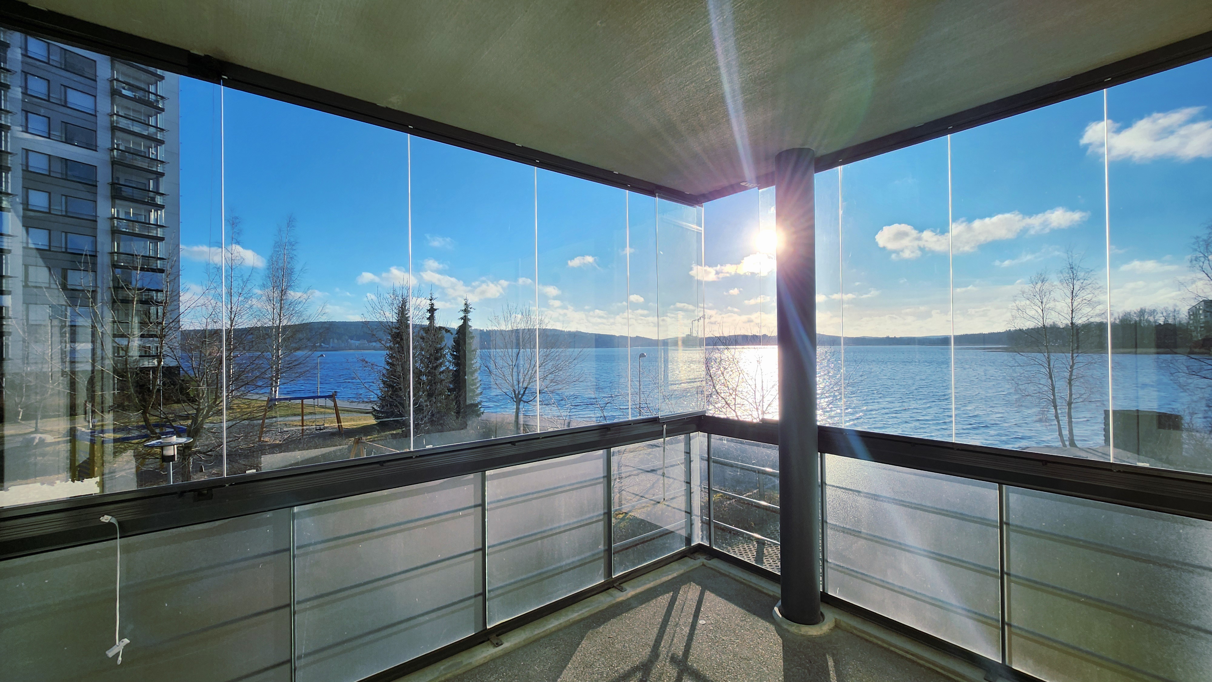 Reilun kokoinen lasitettu parveke on helposti kalustettavissa ja toimii luontevana jatkeena oleskelutilalle.