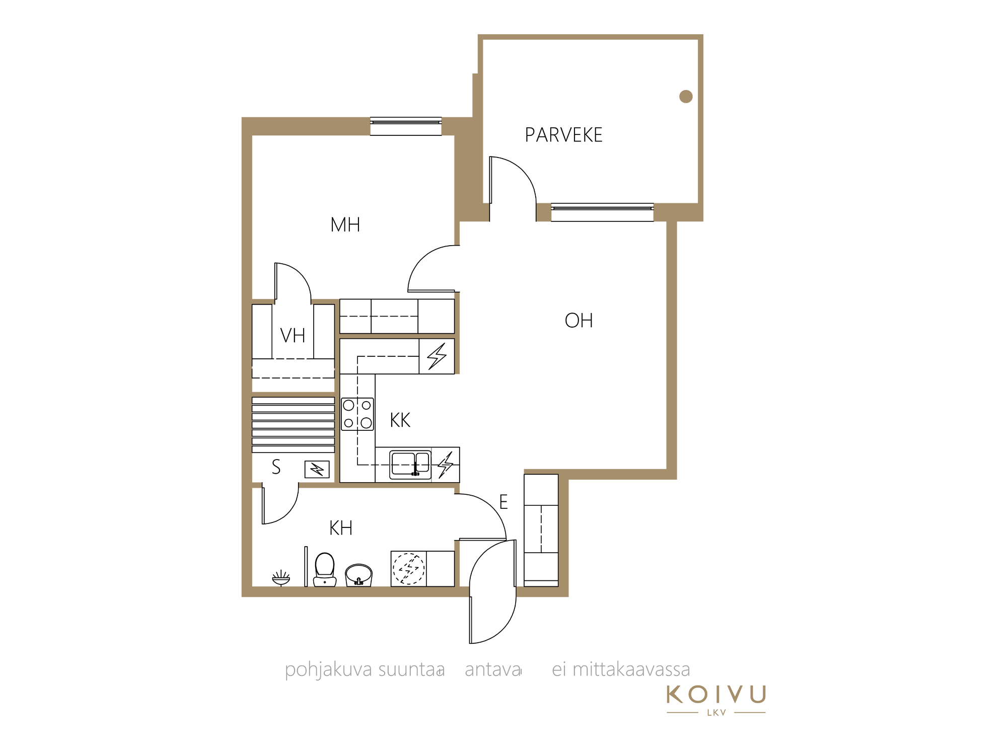 Olohuone ja keittiö muodostavat selkeän kokonaisuuden, josta kulku jatkuu parvekkeelle. Makuuhuoneessa on kaapistot sekä erillinen vaatehuone, joten säilytystilaa on poikkeuksellisen hyvin. Kylpyhuone on hyväkuntoinen, ja sen yhteydessä oleva sauna on ollut vähäisellä käytöllä.
