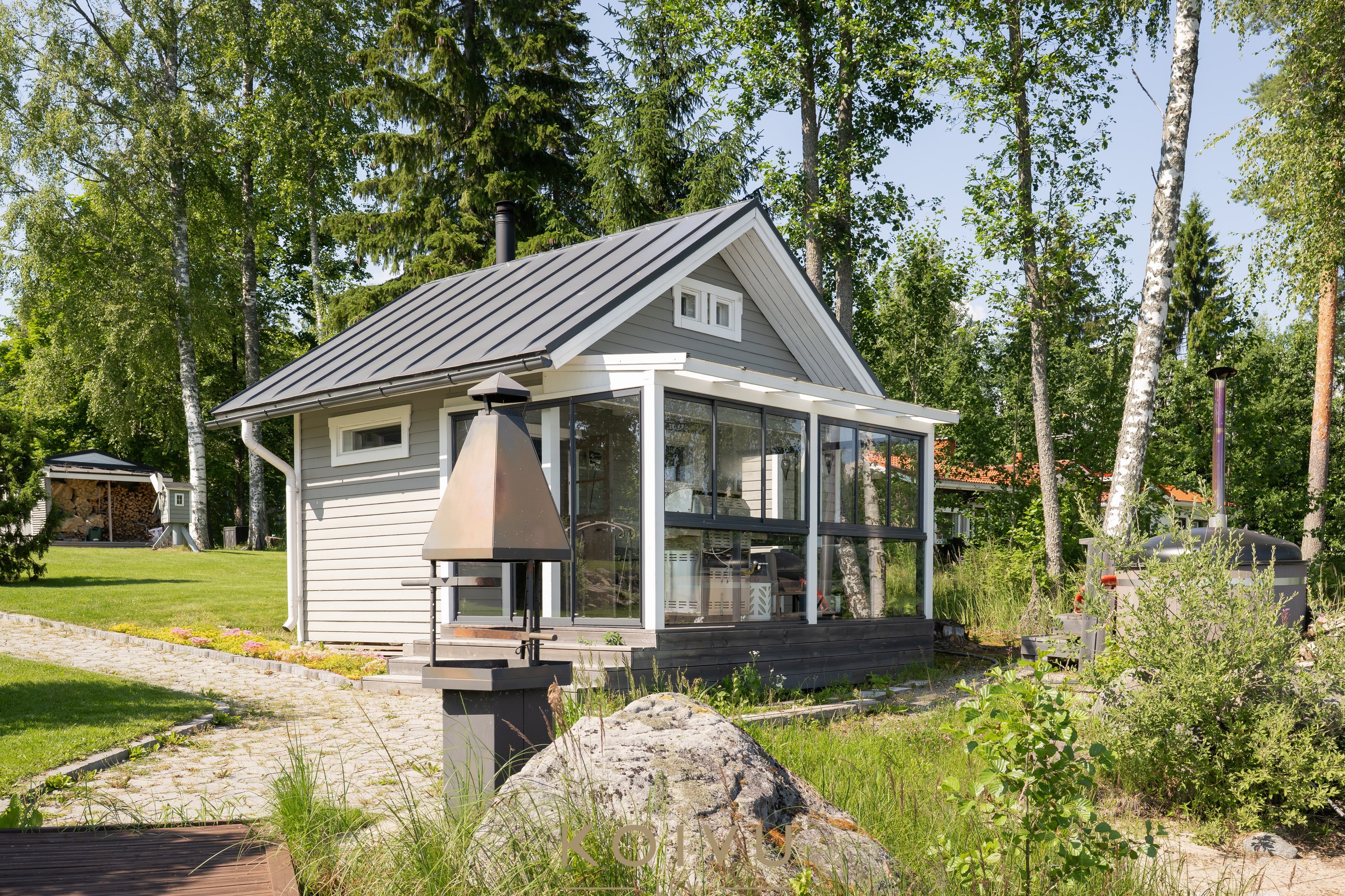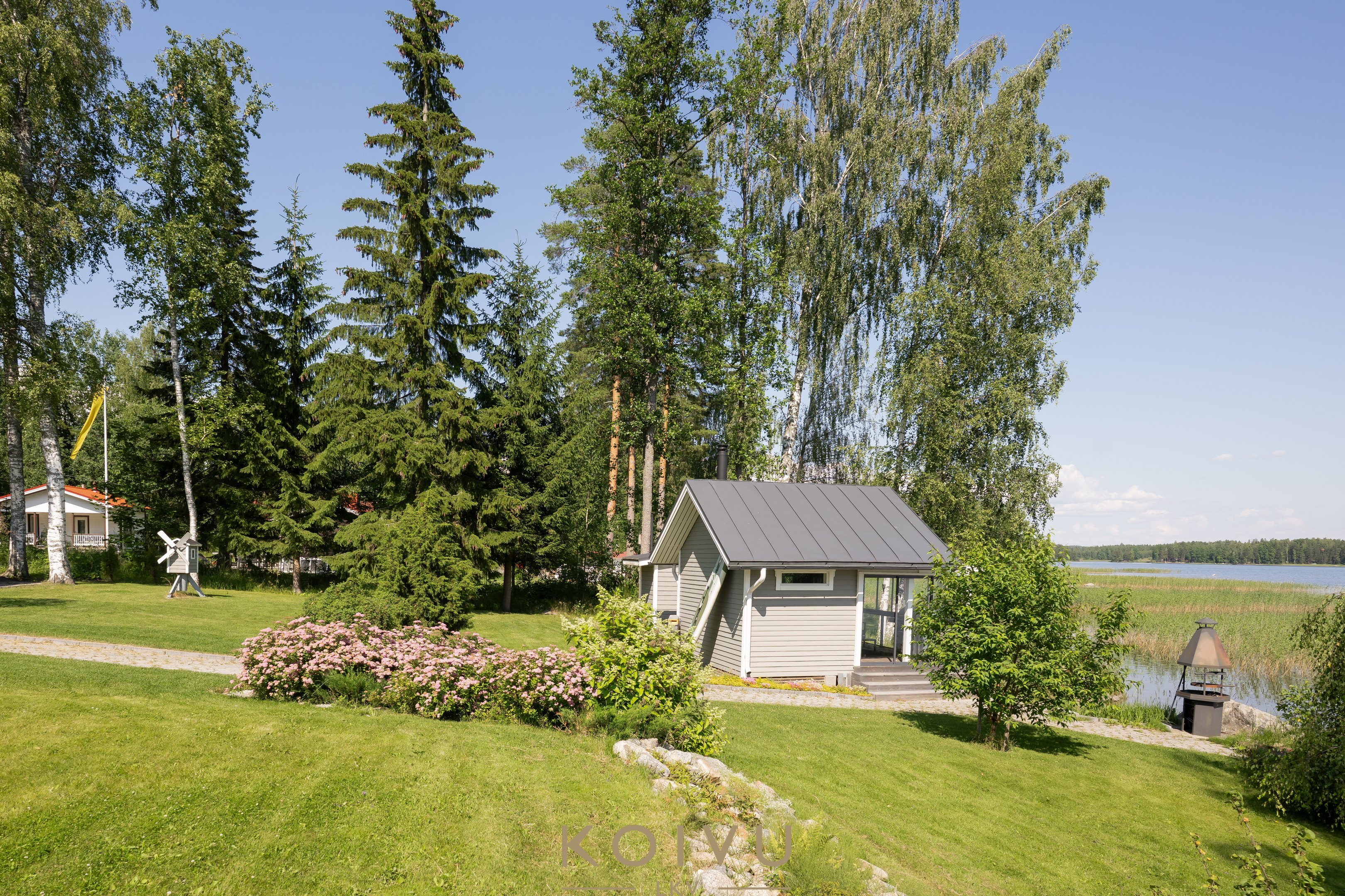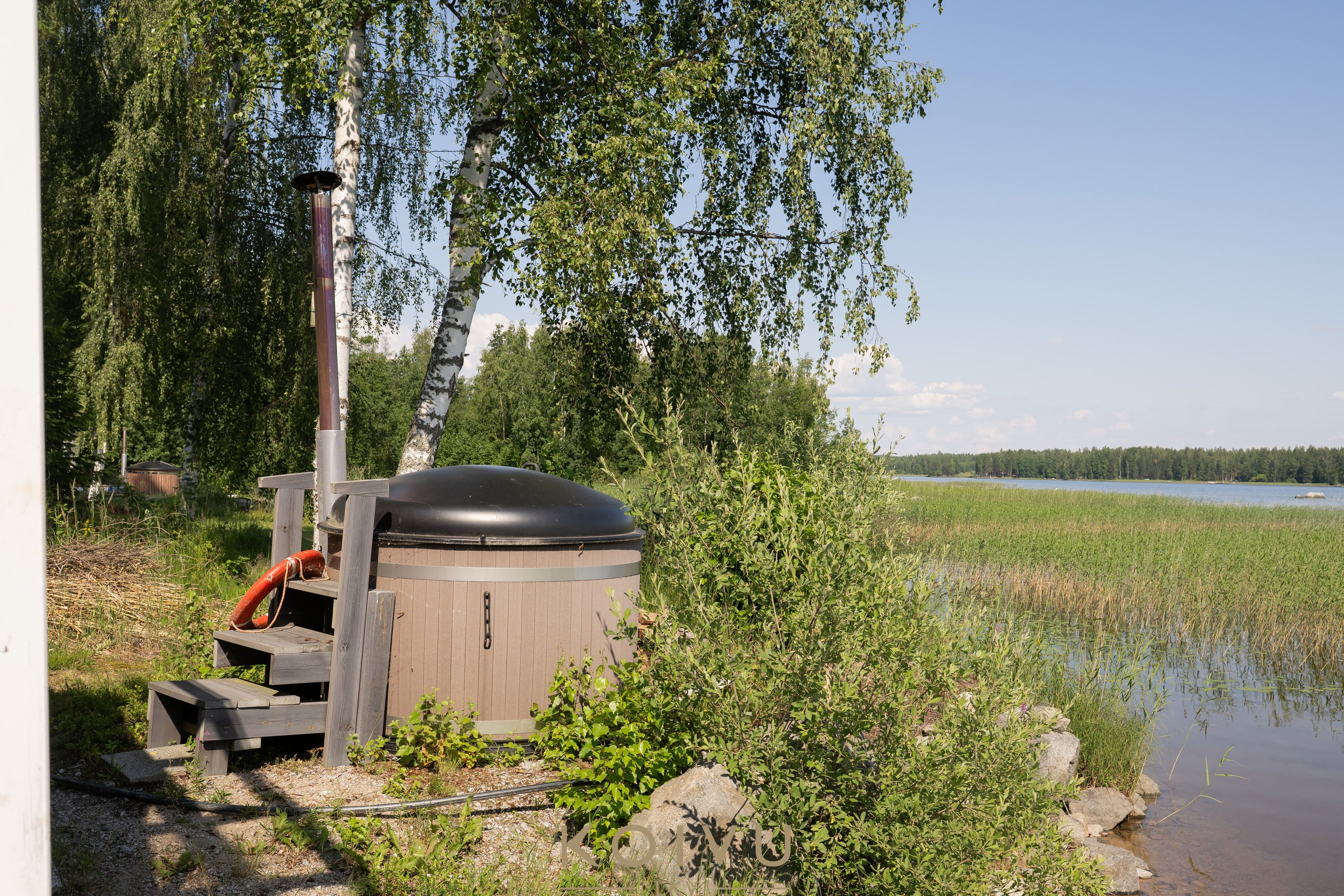 Pihapiiristä löytyy tunnelmallinen puulämmitteinen rantasauna, jonka yhteydessä on myös perinteinen palju – täydellinen paikka rentoutua illan hämärtyessä. Talon edustalla puolestaan odottaa ulkoporeallas. Lasitetut terassit sekä päärakennuksessa että rantasaunalla pidentävät ulkoilunautintoja keväästä syksyyn. Matala ranta ja laituri tekevät paikasta ihanteellisen myös lapsiperheelle.