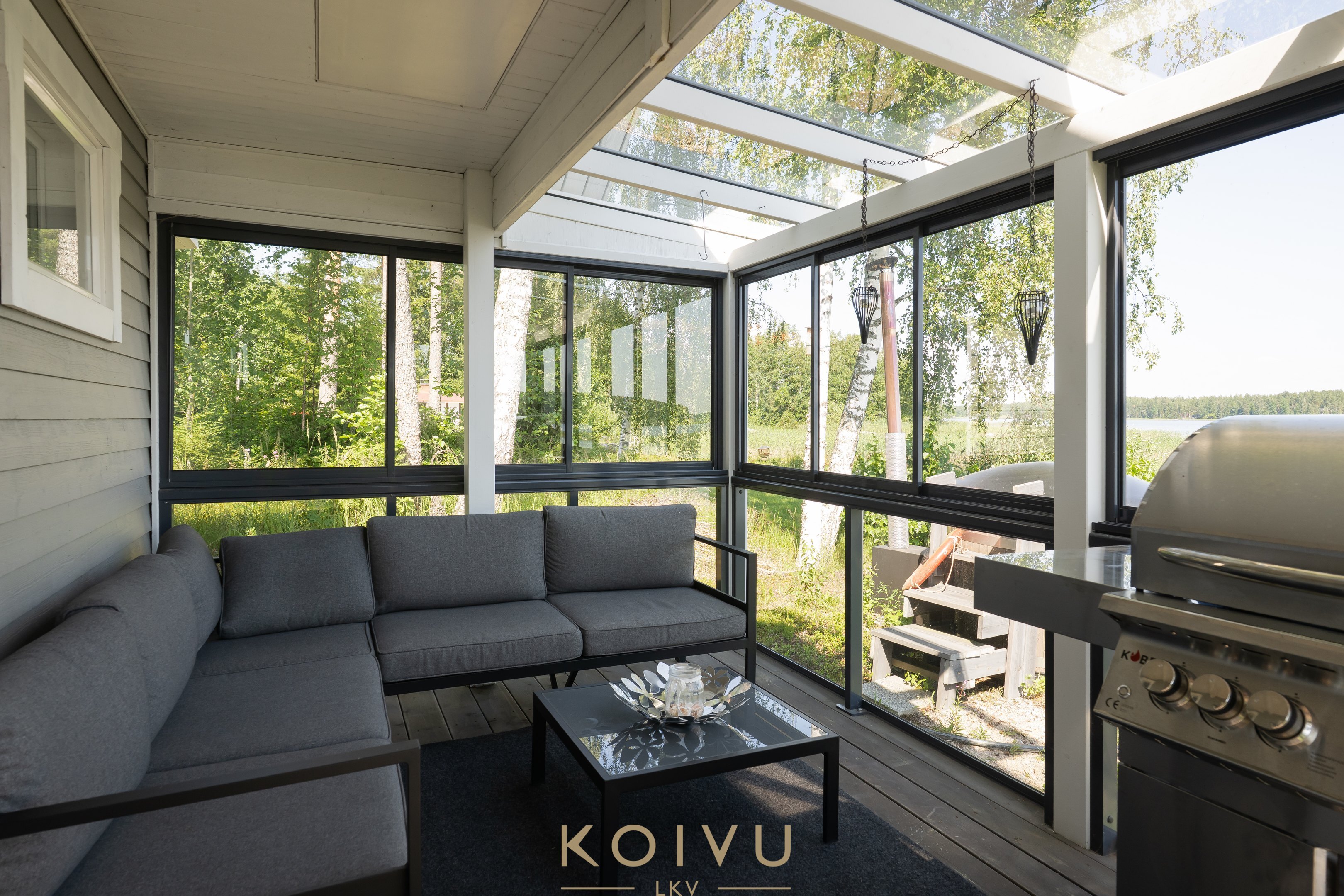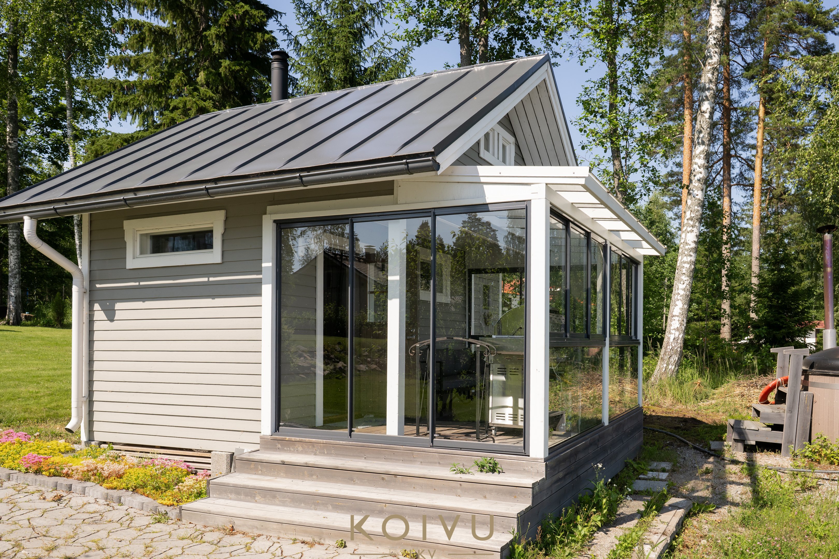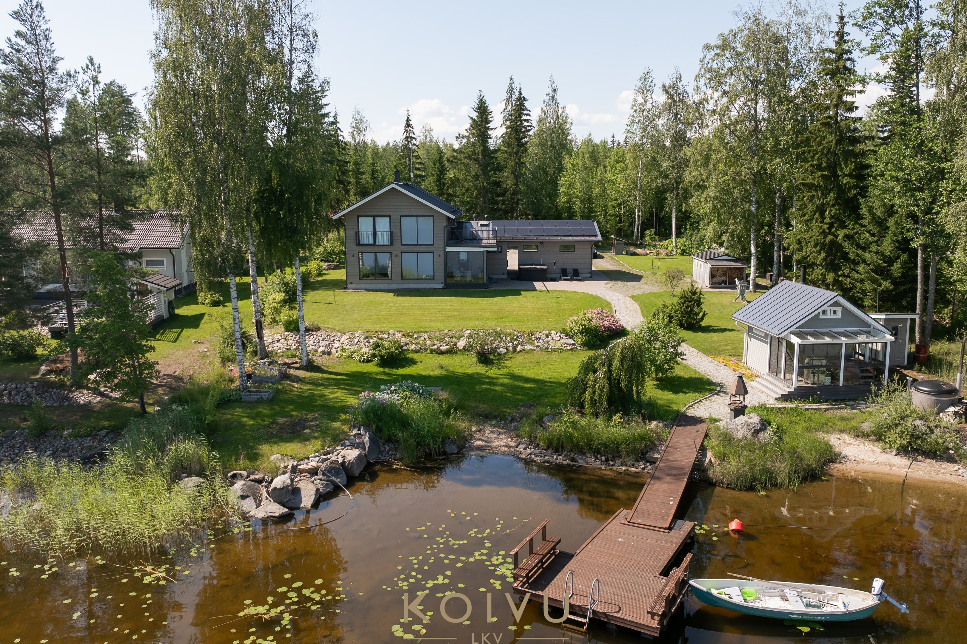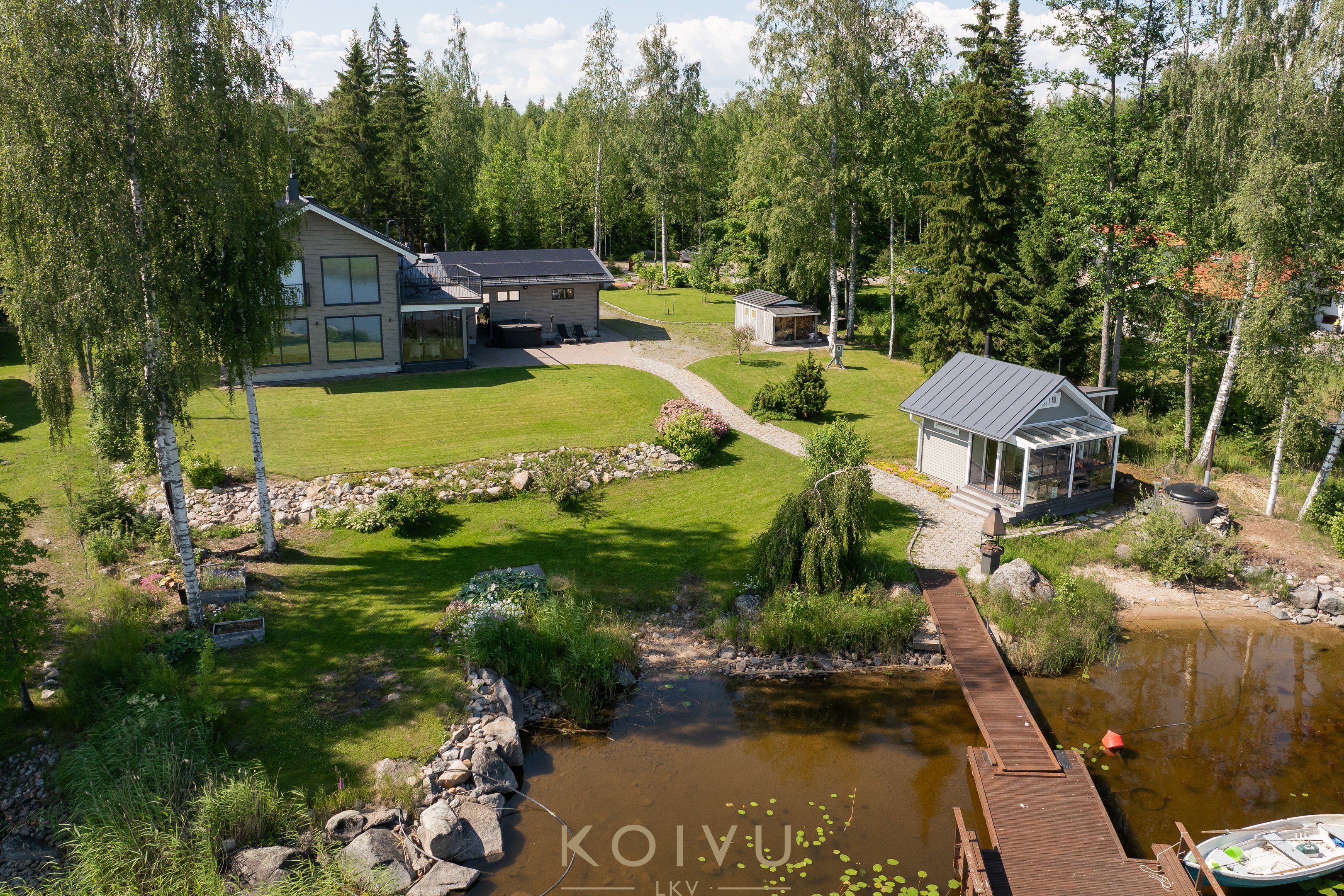 Pihapiiristä löytyy tunnelmallinen puulämmitteinen rantasauna, jonka yhteydessä on myös perinteinen palju – täydellinen paikka rentoutua illan hämärtyessä. Talon edustalla puolestaan odottaa ulkoporeallas. Lasitetut terassit sekä päärakennuksessa että rantasaunalla pidentävät ulkoilunautintoja keväästä syksyyn. Matala ranta ja laituri tekevät paikasta ihanteellisen myös lapsiperheelle.