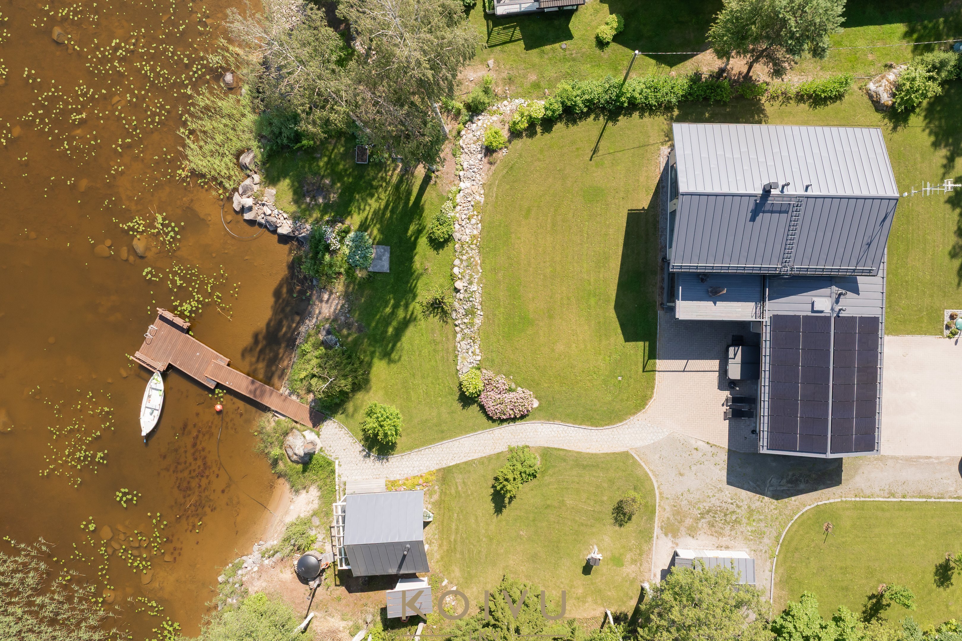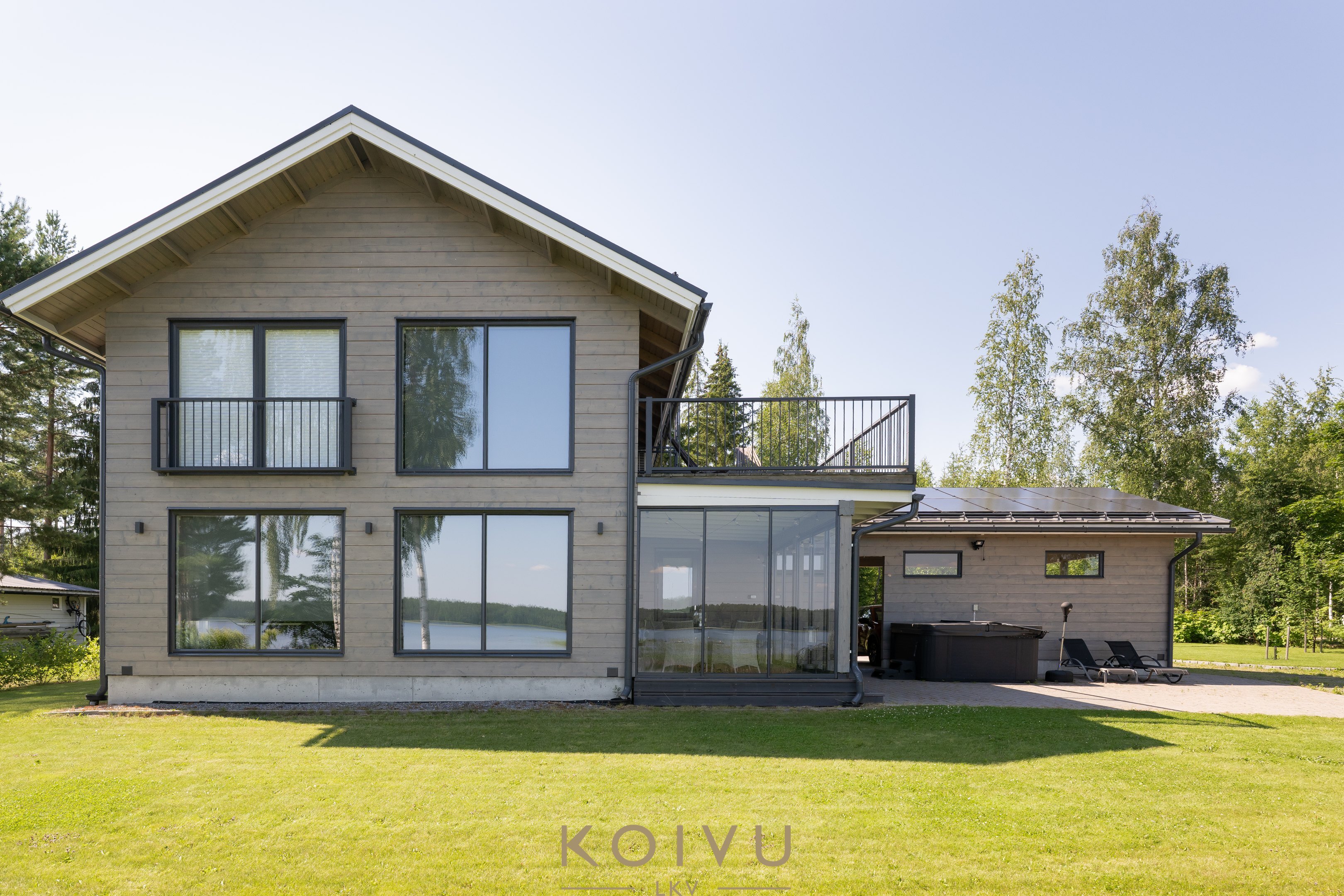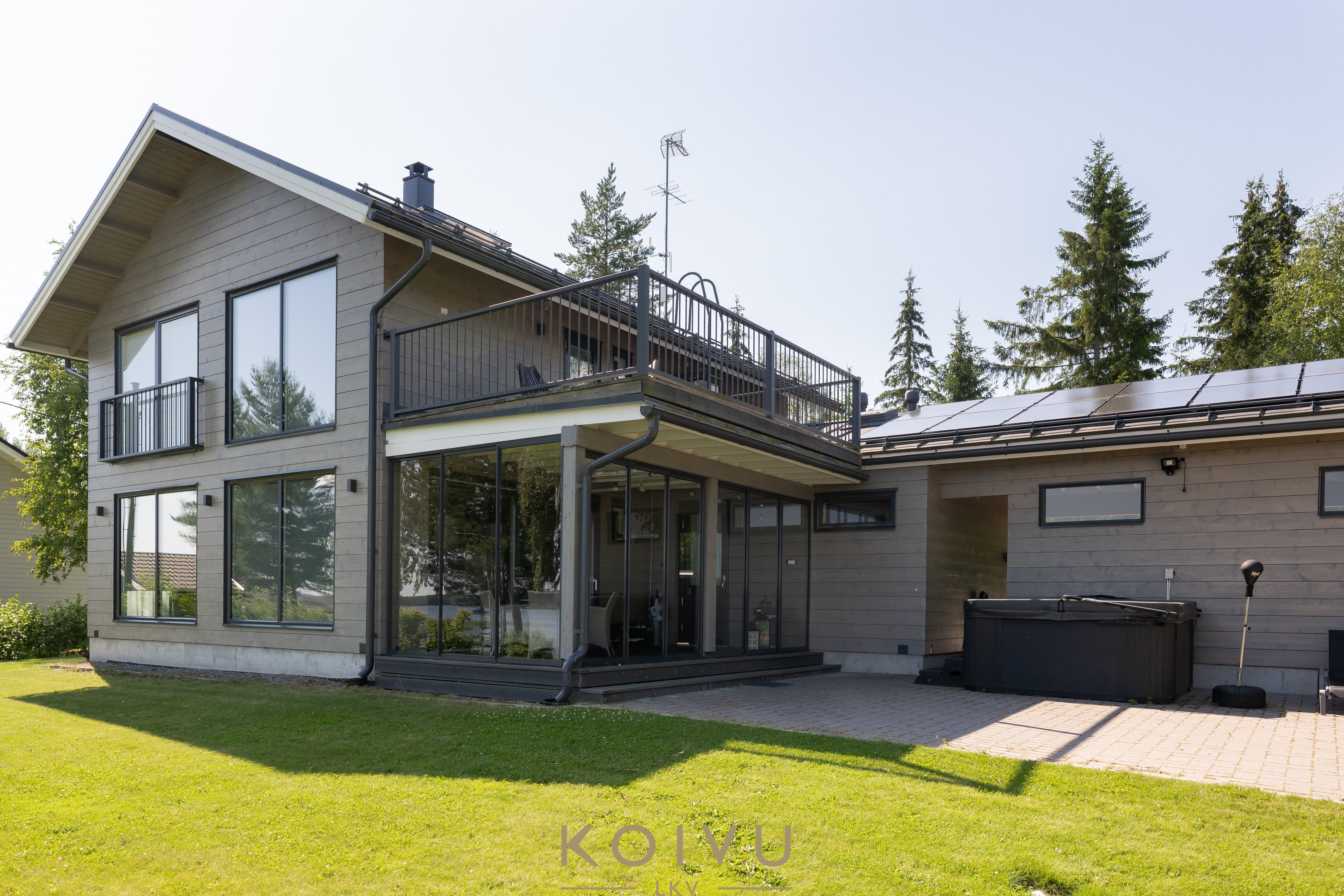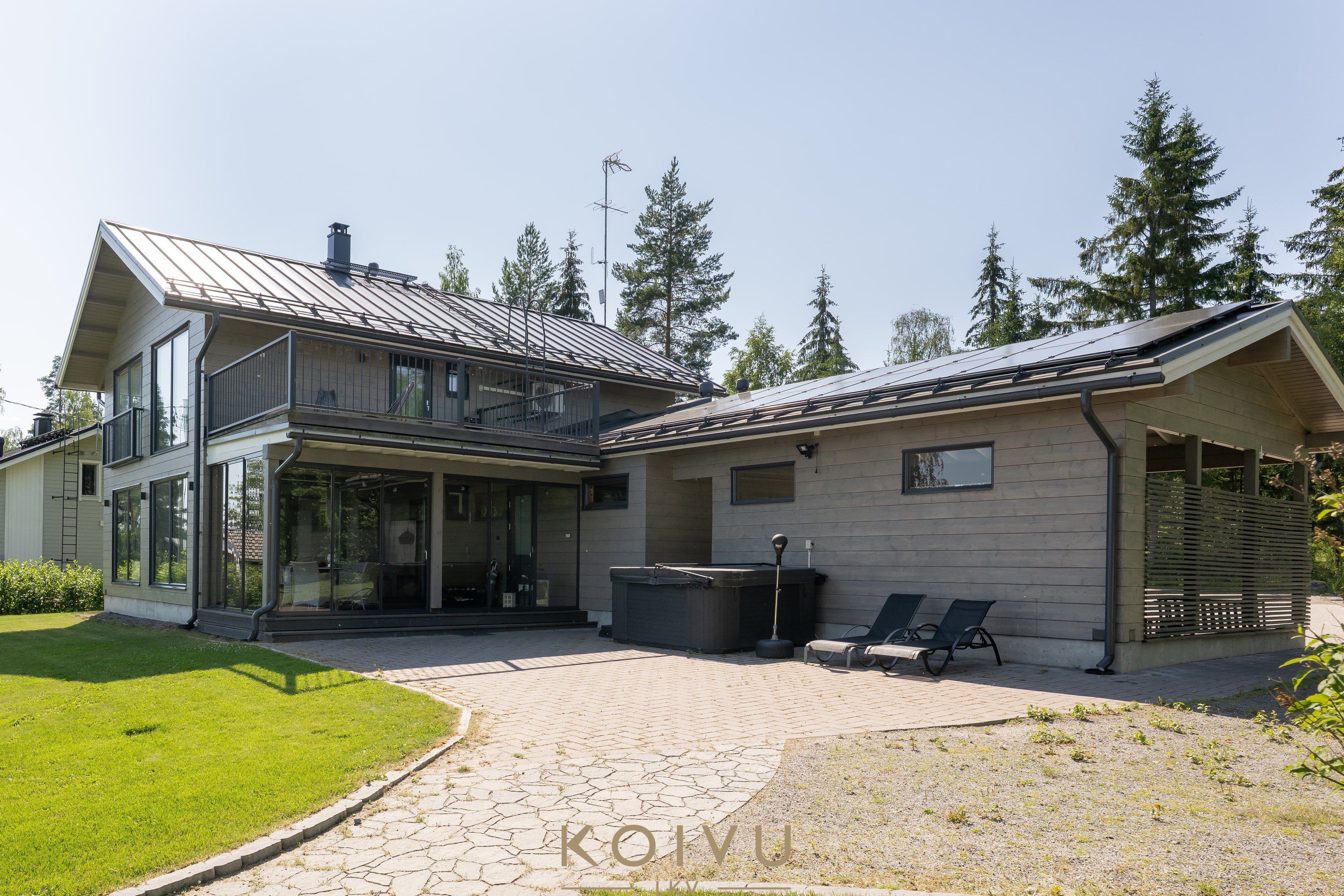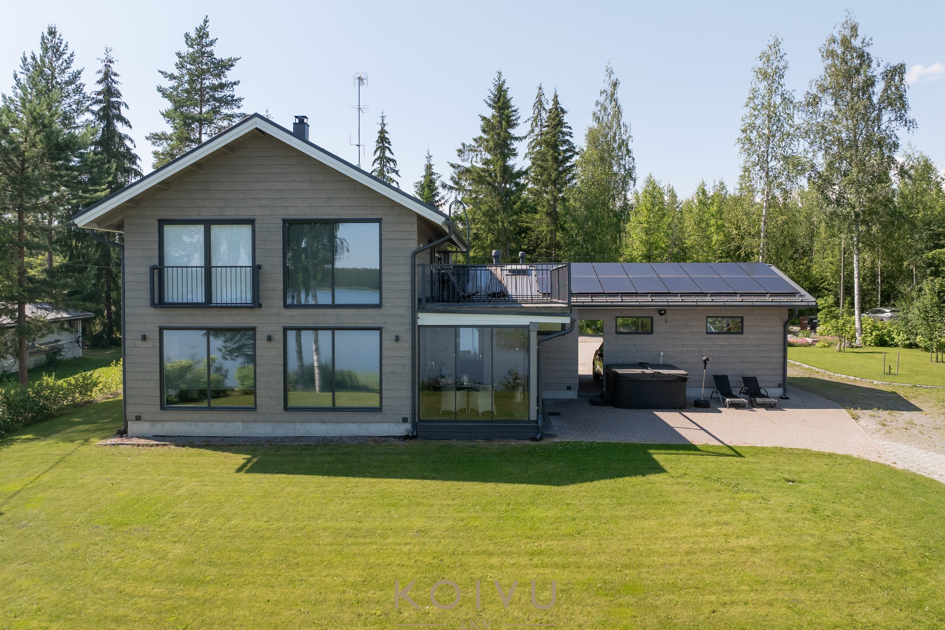 Aurinkopaneelit tuottavat osan talon sähköstä ja tuovat energiatehokkuutta – sähköä voi hyödyntää esimerkiksi sähköauton latauksessa. Lisäksi ilmalämpöpumppu tuo mukavuutta viilennyksellään kesän kuumina päivinä.