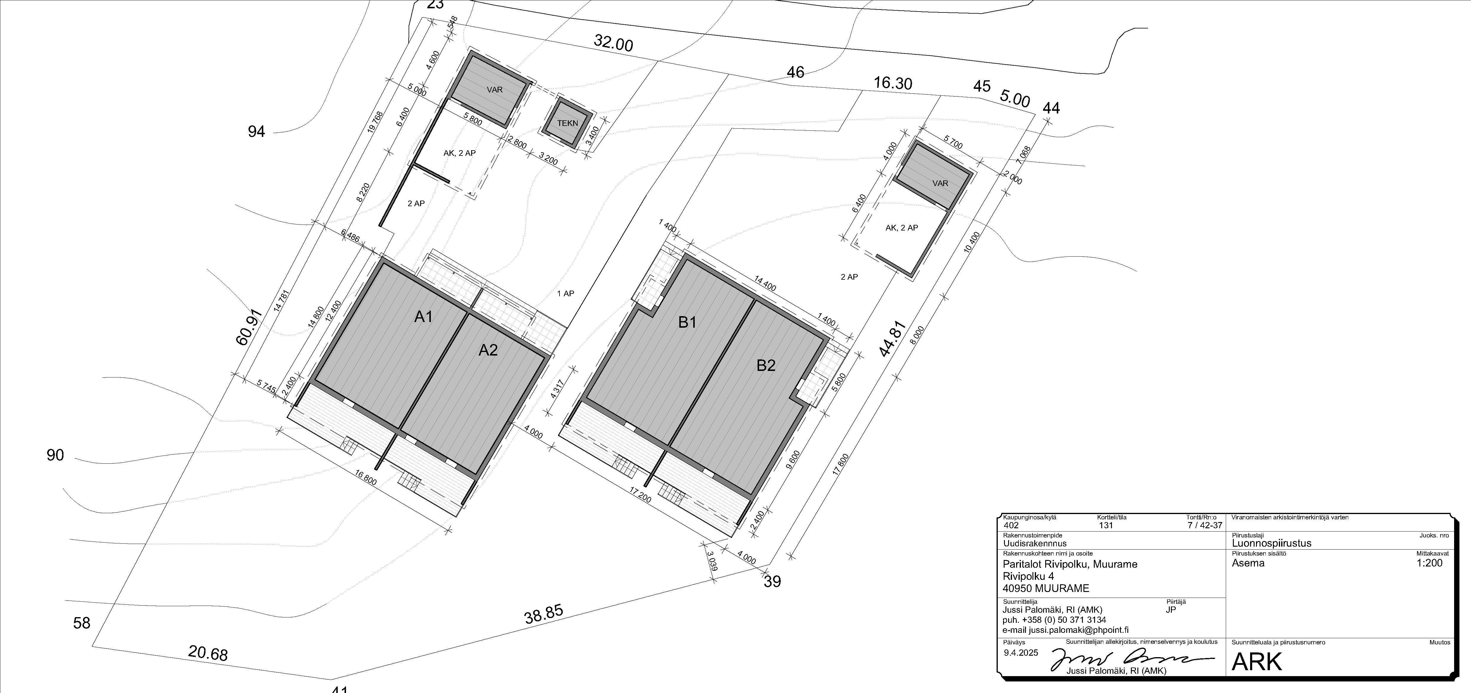 Tontille tulee kaksi paritaloa; talo B on 1-tasoinen ja talo A osittain kolmessa tasossa. Asunto B1 on A-talon puoleinen asunto talossa B.